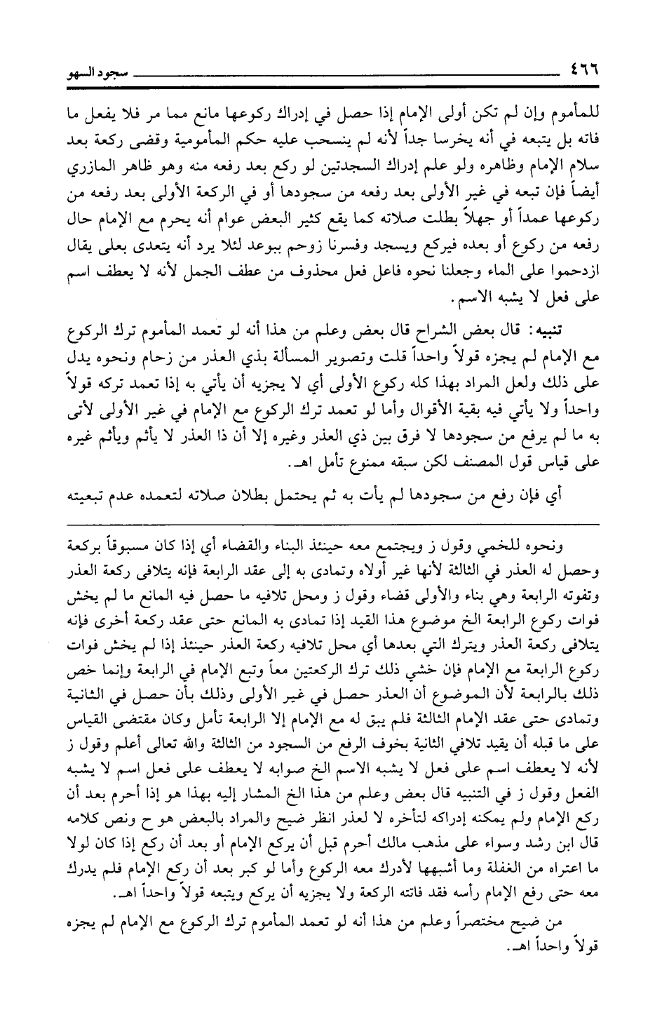 للمأموم وإن لم تكن أولى الإمام إذا حصل في إدراك ركوعها مانع مما مر فلا يفعل ما فاته بل يتبعه في أنه يخرسا جدًّا لأنه لم ينسحب عليه حكم المأمومية وقضى ركعة بعد سلام الإمام وظاهره ولو علم إدراك السجدتين لو ركع بعد رفعه منه وهو ظاهر المازري أيضًا فإن تبعه في غير الأولى بعد رفعه من سجودها أو في الركعة الأولى بعد رفعه من ركوعها عمدًا أو جهلًا بطلت صلاته كما يقع كثير البعض عوام أنه يحرم مع الإمام حال رفعه من ركوع أو بعده فيركع ويسجد وفسرنا زوحم ببوعد لئلا يرد أنه يتعدى بعلى يقال ازدحموا على الماء وجعلنا نحوه فاعل فعل محذوف من عطف الجمل لأنه لا يعطف اسم على فعل لا يشبه الاسم.