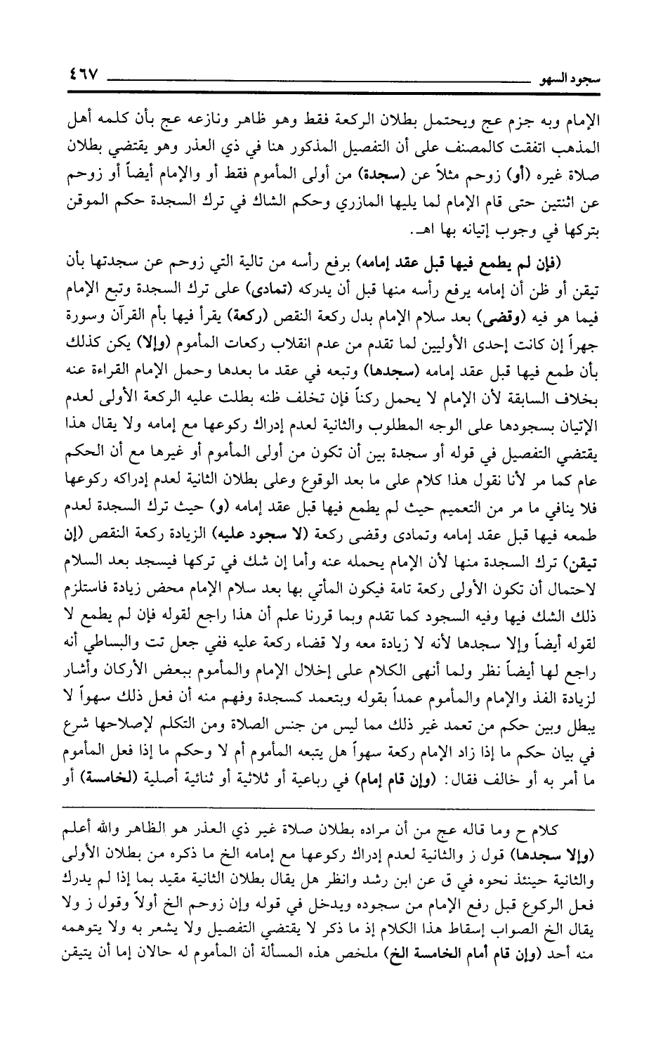 الإمام وبه جزم عج ويحتمل بطلان الركعة فقط وهو ظاهر ونازعه عج بأن كلمه أهل المذهب اتفقت كالمصنف على أن التفصيل المذكور هنا في ذي العذر وهو يقتضي بطلان صلاة غيره (أو) زوحم مثلًا عن (سجدة) من أولى المأموم فقط أو والإمام أيضًا أو زوحم عن اثنتين حتى قام الإمام لما يليها المازري وحكم الشاك في ترك السجدة حكم الموقن بتركها في وجوب إتيانه بها اهـ.