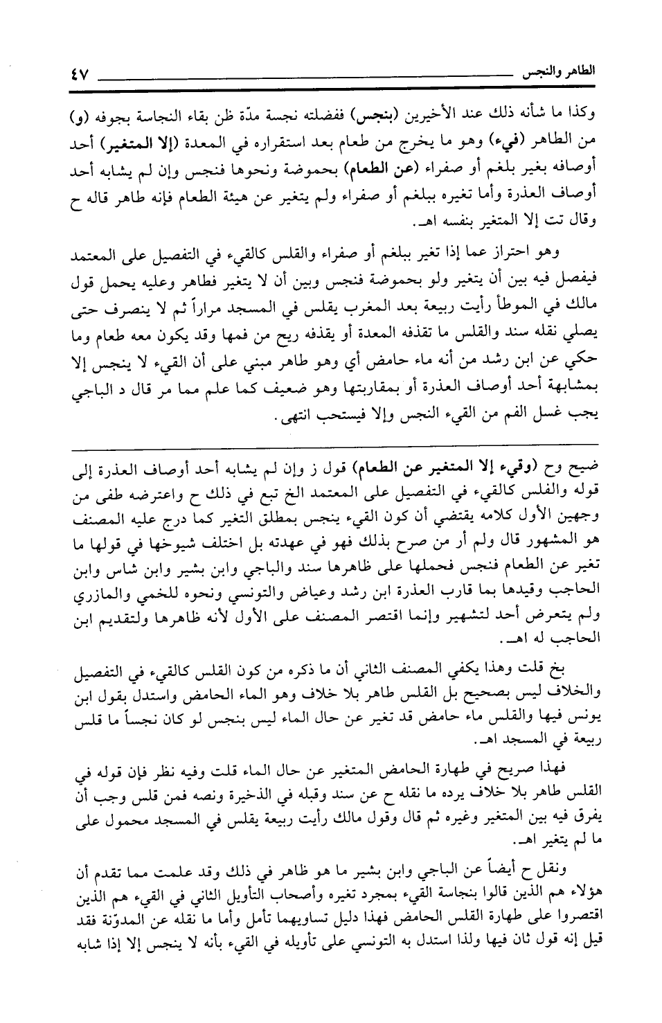 فهذا صريح في طهارة الحامض المتغير عن حال الماء قلت وفيه نظر فإن قوله في القلس طاهر بلا خلاف يرده ما نقله ح عن سند وقبله في الذخيرة ونصه فمن قلس وجب أن يفرق فيه بين المتغير وغيره ثم قال وقول مالك رأيت ربيعة يقلس في المسجد محمول على ما لم يتغير اهـ.
