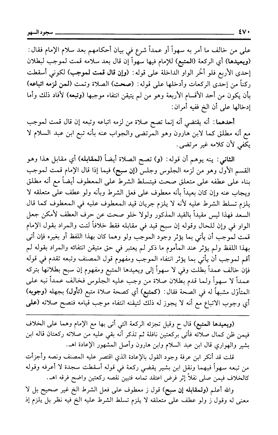 قلت قد أنكر ابن عرفة وجود القول بالإعادة الذي اقتصر عليه المصنف ونصه وأجزأت من تبعه سهوًا فيهما ونقل ابن بشير يقضي ركعة في قوله أسقطت سجدة لا أعرفه وقوله كالخلاف فيمن صلى نفلًا إثر فرض اعتقد تمامه فتبين نقصه ركعتين واضح فرقه اهـ.