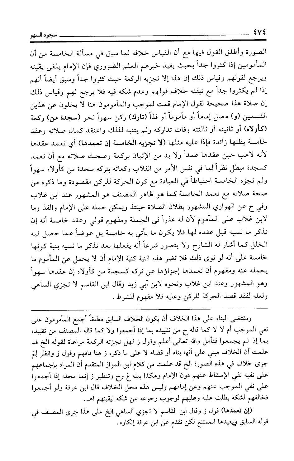 الصورة وأطلق القول فيها مع أن القياس خلافه لما سبق في مسألة الخامسة من أن المأمومين إذا كثروا جدًّا بحيث يفيد خبرهم العلم الضروري فإن الإمام يلغى يقينه ويرجع لقولهم وقياس ذلك إن هذا إلا تجزيه الركعة حيث كثروا جدًّا وسبق أيضًا أنهم إذا لم يكثروا جدًّا مع تيقنه خلاف قولهم وعدم شكه فيه فلا يرجع لهم وقياس ذلك إن صلاة هذا صحيحة لقول الإمام قمت لموجب والمأمومون هنا لا يخلون عن هذين القسمين (و) مصل إمامًا أو مأمومًا أو فذًّا (تارك) ركن سهوًا نحو (سجدة من) ركعة (كأولاه) أو ثانيته أو ثالثته وفات تداركه ولم يتنبه لذلك واعتقد كمال صلاته وعقد خامسة يظنها زائدة فإذا عليه مثلها (لا تجزيه الخامسة إن تعمدها) أي تعمد عقدها لأنه لاعب حين عقدها عمدًا ولا بد من الإتيان بركعة وصحت صلاته مع أن تعمد كسجدة مبطل نظرًا لما في نفس الأمر من انقلاب ركعاته بتركه سجدة من كأولاه سهوًا ولم تجزه الخامسة احتياطًا في العبادة مع كون الحركة للركن مقصودة وما ذكره من صحة صلاته مع تعمد الخامسة كما هو ظاهر المصنف هو المشهور عند ابن غلاب وفي ح عن الهواري المشهور بطلان الصلاة حينئذ ويمكن حمله على الإمام والفذ وما لابن غلاب على المأموم لأن له عذرًا في الجملة ومفهوم قولي وعقد خامسة أنه إن تذكر ما نسيه قبل عقده لها فلا يكون ما يأتي به خامسة بل عوضًا عما حصل فيه الخلل كما أشار له الشارح ولا يتصور شرعًا أنه يفعلها بعد تذكر ما نسيه بنية كونها خامسة على أنه لو نوى ذلك فلا تضر هذه النية كنية الإمام أن لا يحمل عن المأموم ما يحمله عنه ومفهوم أن تعمدها إجزاؤها عن تركه كسجدة من كأولاه إن عقدها سهوًا وهو المشهور وعند ابن غلاب ونحوه لابن أبي زيد وقال ابن القاسم لا تجزي الساهي ولعله لفقد قصد الحركة للركن وعليه فلا مفهوم للشرط.