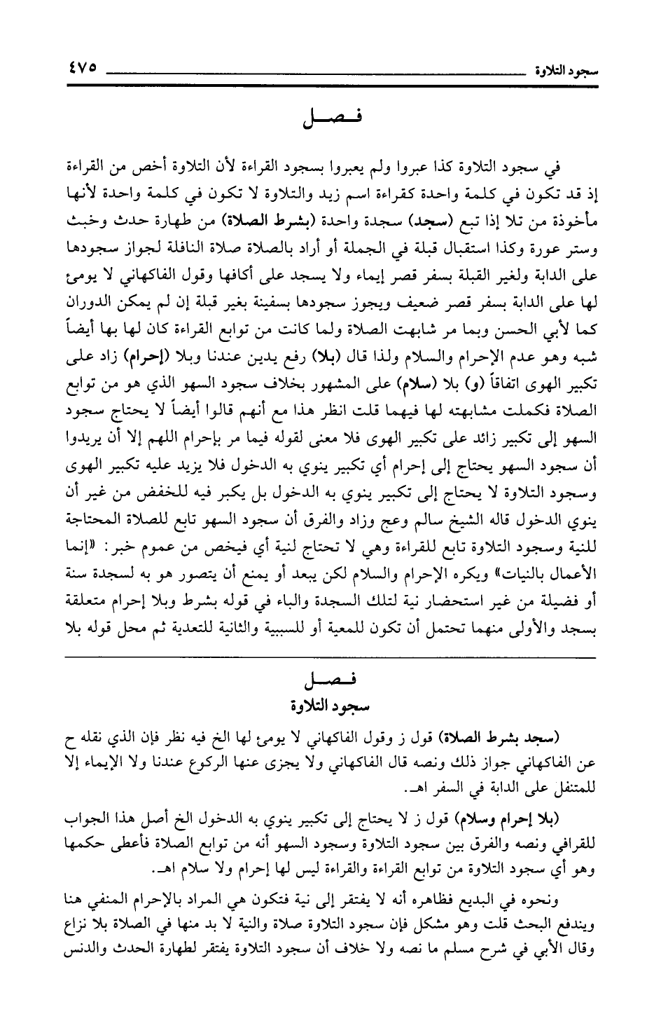 ونحوه في البديع فظاهره أنه لا يفتقر إلى نية فتكون هي المراد بالإحرام المنفي هنا ويندفع البحث قلت وهو مشكل فإن سجود التلاوة صلاة والنية لا بد منها في الصلاة بلا نزاع وقال الأبي في شرح مسلم ما نصه ولا خلاف أن سجود التلاوة يفتقر لطهارة الحدث والدنس