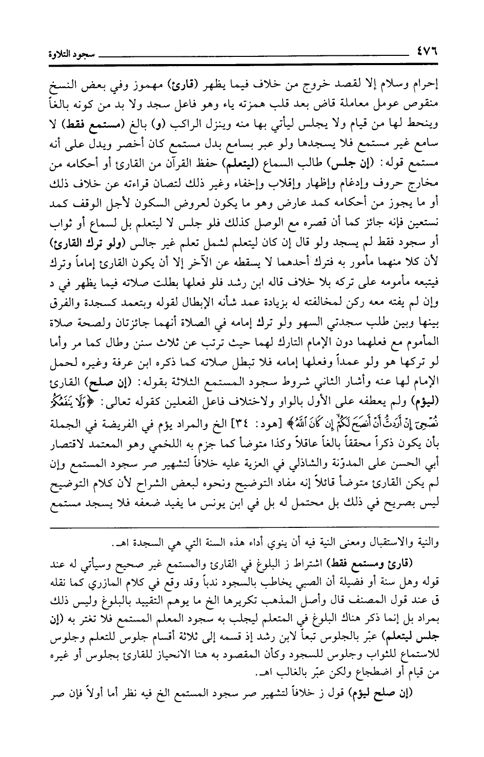 إحرام وسلام إلا لقصد خروج من خلاف فيما يظهر (قارئ) مهموز وفي بعض النسخ منقوص عومل معاملة قاض بعد قلب همزته ياء وهو فاعل سجد ولا بد من كونه بالغًا وينحط لها من قيام ولا يجلس ليأتي بها منه وينزل الراكب (و) بالغ (مستمع فقط) لا سامع غير مستمع فلا يسجدها ولو عبر بسامع بدل مستمع كان أخصر ويدل على أنه مستمع قوله: (إن جلس) طالب السماع (ليتعلم) حفظ القرآن من القارئ أو أحكامه من مخارج حروف وإدغام وإظهار وإقلاب وإخفاء وغير ذلك لتصان قراءته عن خلاف ذلك أو ما يجوز من أحكامه كمد عارض وهو ما يكون لعروض السكون لأجل الوقف كمد نستعين فإنه جائز كما أن قصره مع الوصل كذلك فلو جلس لا ليتعلم بل لسماع أو ثواب أو سجود فقط لم يسجد ولو قال إن كان ليتعلم لشمل تعلم غير جالس (ولو ترك القارئ) لأن كلا منهما مأمور به فترك أحدهما لا يسقطه عن الآخر إلا أن يكون القارئ إمامًا وترك فيتبعه مأمومه على تركه بلا خلاف قاله ابن رشد فلو فعلها بطلت صلاته فيما يظهر في د وإن لم يفته معه ركن لمخالفته له بزيادة عمد شأنه الإبطال لقوله وبتعمد كسجدة والفرق بينها وبين طلب سجدتي السهو ولو ترك إمامه في الصلاة أنهما جائزتان ولصحة صلاة المأموم مع فعلهما دون الإمام التارك لهما حيث ترتب عن ثلاث سنن وطال كما مر وأما لو تركها هو ولو عمدًا وفعلها إمامه فلا تبطل صلاته كما ذكره ابن عرفة وغيره لحمل الإمام لها عنه وأشار الثاني شروط سجود المستمع الثلاثة بقوله: (إن صلح) القارئ (ليؤم) ولم يعطفه على الأول بالواو ولاختلاف فاعل الفعلين كقوله تعالى: {وَلَا يَنْفَعُكُمْ نُصْحِي إِنْ أَرَدْتُ أَنْ أَنْصَحَ لَكُمْ إِنْ كَانَ اللَّهُ} [هود: 34] الخ والمراد يؤم في الفريضة في الجملة بأن يكون ذكرًا محققًا بالغًا عاقلًا وكذا متوضأ كما جزم به اللخمي وهو المعتمد لاقتصار أبي الحسن على المدوّنة والشاذلي في العزية عليه خلافًا لتشهير صر سجود المستمع وإن لم يكن القارئ متوضأ قائلًا إنه مفاد التوضيح ونحوه لبعض الشراح لأن كلام التوضيح ليس بصريح في ذلك بل محتمل له بل في ابن يونس ما يفيد ضعفه فلا يسجد مستمع