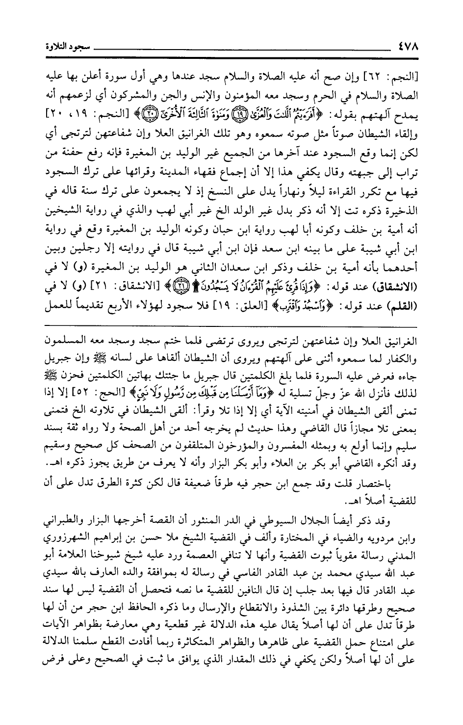 وقد ذكر أيضًا الجلال السيوطي في الدر المنثور أن القصة أخرجها البزار والطبراني وابن مردويه والضياء في المختارة وألف في القضية الشيخ ملا حسن بن إبراهيم الشهرزوري المدني رسالة مقويًّا ثبوت القضية وأنها لا تنافي العصمة ورد عليه شيخ شيوخنا العلامة أبو عبد الله سيدي محمد بن عبد القادر الفاسي في رسالة له بموافقة والده العارف بالله سيدي عبد القادر قال فيها بعد جلب إن قال النافين للقضية ما نصه فتحصل أن القضية ليس لها سند صحيح وطرقها دائرة بين الشذوذ والانقطاع والإرسال وما ذكره الحافظ ابن حجر من أن لها طرقًا تدل على أن لها أصلًا يقال عليه هذه الدلالة غير قطعية وهي معارضة بظواهر الآيات على امتناع حمل القضية على ظاهرها والظواهر المتكاثرة ربما أفادت القطع سلمنا الدلالة على أن لها أصلًا ولكن يكفي في ذلك المقدار الذي يوافق ما ثبت في الصحيح وعلى فرض