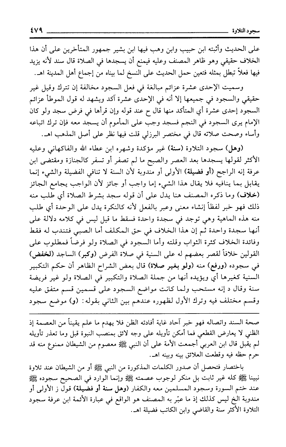 باختصار فتحصل أن صدور الكلمات المذكورة من النبي - صلى الله عليه وسلم - أو من الشيطان عند تلاوة نبينا - صلى الله عليه وسلم - كله غير ثابت بل منكر لوجوب عصمته - صلى الله عليه وسلم - وإنما الوارد في الصحيح سجوده - صلى الله عليه وسلم - عند ختم السورة وسجود المسلمين معه والكفار (وهل سنة أو فضيلة) قول ز الأولى أو مندوبة الخ ليس كذلك إذ ما عبّر به المصنف هو الواقع في عبارة الأئمة ابن عرفة سجود التلاوة الأكثر سنة والقاضي وابن الكاتب فضيلة اهـ.