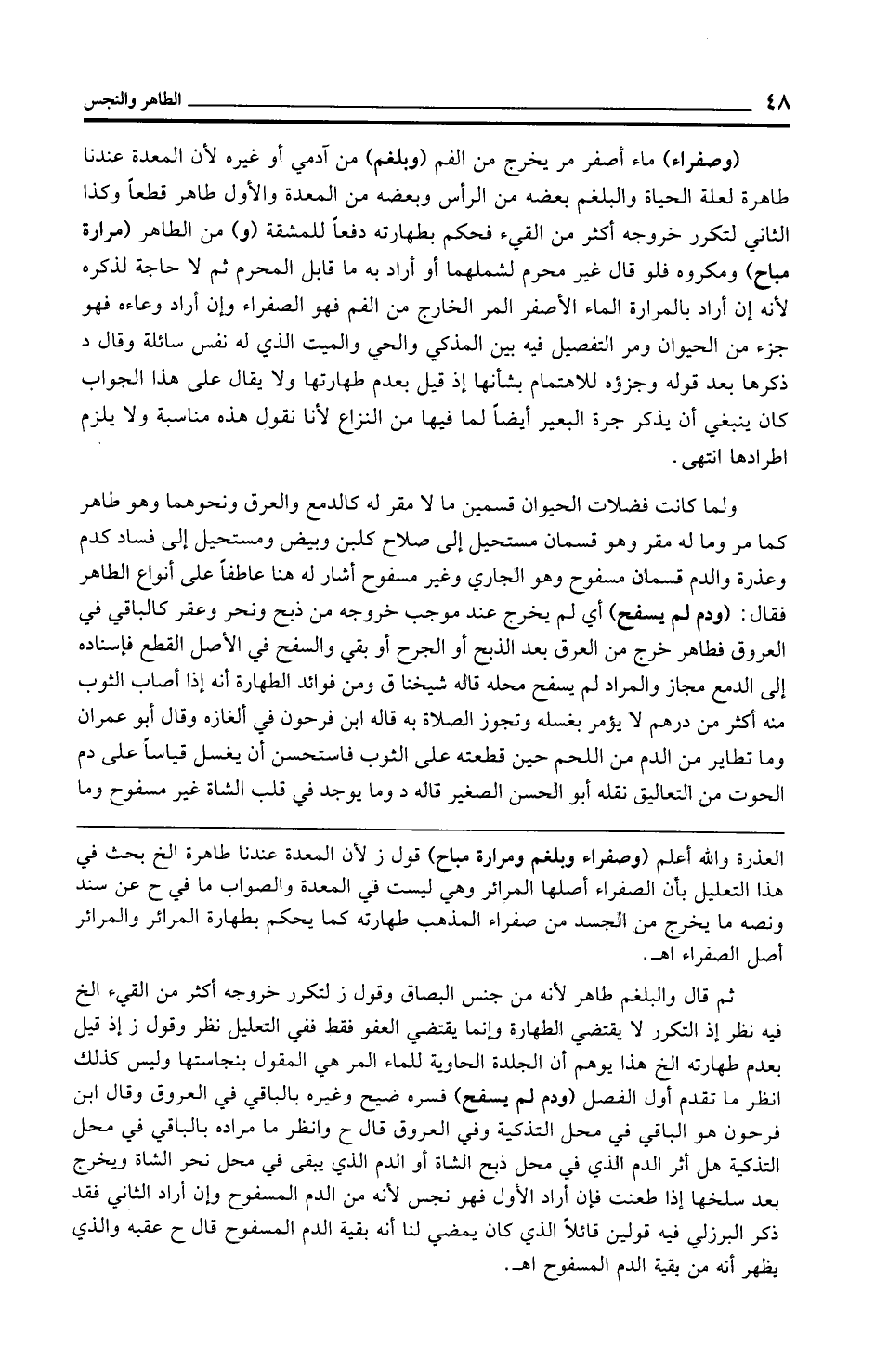 ثم قال والبلغم طاهر لأنه من جنس البصاق وقول ز لتكرر خروجه أكثر من القيء الخ فيه نظر إذ التكرر لا يقتضي الطهارة وإنما يقتضي العفو فقط ففي التعليل نظر وقول ز إذ قيل بعدم طهارته الخ هذا يوهم أن الجلدة الحاوية للماء المر هي المقول بنجاستها وليس كذلك انظر ما تقدم أول الفصل (ودم لم يسفح) فسره ضيح وغيره بالباقي في العروق وقال ابن فرحون هو الباقي في محل التذكية وفي العروق قال ح وانظر ما مراده بالباقي في محل التذكية هل أثر الدم الذي في محل ذبح الشاة أو الدم الذي يبقى في محل نحو الشاة ويخرج بعد سلخها إذا طعنت فإن أراد الأول فهو نجس لأنه من الدم المسفوح وإن أراد الثاني فقد ذكر البرزلي فيه قولين قائلًا الذي كان يمضي لنا أنه بقية الدم المسفوح قال ح عقبه والذي يظهر أنه من بقية الدم المسفوح اهـ.
