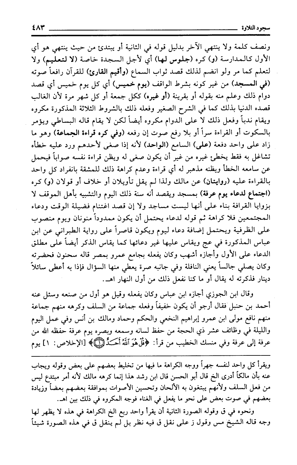 ونصف كلمة ولا ينتهي الآخر بدليل قوله في الثانية أو يبتدئ من حيث ينتهي هو أي الأول كالمدارسة (و) كره (جلوس لها) أي لأجل السجدة خاصة (لا لتعليم) ولا لتعلم كما مر ولو انضم لذلك قصد ثواب السماع (وأقيم القارئ) للقرآن رافعًا صوته (في المسجد) من غير كونه بشرط الواقف (يوم خميس) أي كل يوم خميس أي قصد دوام ذلك وعلم منه بقوله أو بقرينة (أو غيره) ككل جمعة أو كل شهر مرة لأن الغالب قصده الدنيا بذلك كما في الشرح الصغير وفعله ذلك بالشروط الثلاثة المذكورة مكروه ويقام ندبًا وفعل ذلك لا على الدوام مكروه أيضًا لكن لا يقام قاله البساطي ويؤمر بالسكوت أو القراءة سرًّا أو بلا رفع صوت إن رفعه (وفي كره قراءة الجماعة) وهو ما زاد على واحد دفعة (على) السامع (الواحد) لأنه إذا صغى لأحدهم ورد عليه خطأه تشاغل به فقط يخطيء غيره من غير أن يكون صغى له ويظن قراءة نفسه صوابًا فيحمل عن سامعه الخطأ ويظنه مذهبر له أي قراءة وعدم كراهة ذلك للمشقة بانفراد كل واحد بالقراءة عليه (روايتان) عن مالك ولذا لم يقل تأويلان أو خلاف أو قولان (و) كره (اجتماع لدعاء يوم عرفة) بمسجد ويقصد أنه سنة ذلك اليوم والتشبيه بأهل الموقف لا بزوايا القرافة بناء على أنها ليست مساجد ولا إن قصد اغتنام فضيلة الوقت ودعاء المجتمعين فلا كراهة ثم قوله لدعاء يحتمل أن يكون ممدودًا منونان ويوم منصوب على الظرفية ويحتمل إضافة دعاء ليوم ويكون قاصرًا على رواية الطبراني عن ابن عباس المذكورة في عج ويقاس عليها غير دعائها كما يقاس الذكر أيضًا على مطلق الدعاء على الأول وأجازه أشهب وكان يفعله بجامع عمرو بمصر قاله سحنون فحضرته وكان يصلي جالسًا يعني النافلة وفي جانبه صرة يعطي منها السؤال فإذا به أعطى سائلًا دينار فذكرته له يقال أو ما كنا نفعل ذلك من أول النهار اهـ.