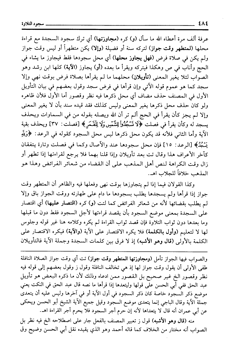 عرفة ألف مرة أعطاه الله ما سأل (و) كره (مجاوزتها) أي ترك سجود السجدة مع قراءة محلها (لمتطهر وقت جواز) لتركه سنة أو فضيلة (وإلا) يكن متطهرًا أو ليس وقت جواز ولم يكن في صلاة فرض (فهل يجاوز محلها) أي محل سجودها فقط فيجاوز ما يشاء في الحج وأناب في ص وهكذا فيتركه ويقرأ ما بعده (أو) يجاوز (الآية) كلها ابن رشد وهو الصواب لئلا يغير المعنى (تأويلان) محلهما ما لم يقرأها بصلاة فرض بوقت نهي وإلا سجد كما هو عموم قوله الآتي وإن قرأها في فرض سجد وقول بعضهم في بيان التأويل الأول في المصنف حذف مضاف أي محل ذكرها فيه نظر وقصور أما الأول فلأن ظاهره ولو كان حذف محل ذكرها يغير المعنى وليس كذلك فقد قيده سند بأن لا يغير المعنى وإلا لم يجز كأن يقرأ في الحج ألم تر أن الله ويصله بقوله من في السماوات ويحذف يسجد له وكأن يقرأ في فصلت {لَا تَسْجُدُوا لِلشَّمْسِ وَلَا لِلْقَمَرِ} [فصلت: 37] ويحذف بقية الآية وأما الثاني فلأنه قد يكون محل ذكرها ليس محل السجود كقوله في الرعد: {وَلِلَّهِ يَسْجُدُ} [الرعد: 15] فإن محل سجودها عند والآصال وكما في فصلت وتارة يتفقان كآخر الأعراف هذا وقال تت بعد تأويلان وإذا قلنا بهما فلا يرجع لقراءتها إذا تطهر أو زال وقت الكراهة لنص أهل المذهب على أن القضاء من شعائر الفرائض وهذا هو المذهب خلافًا للجلاب اهـ.