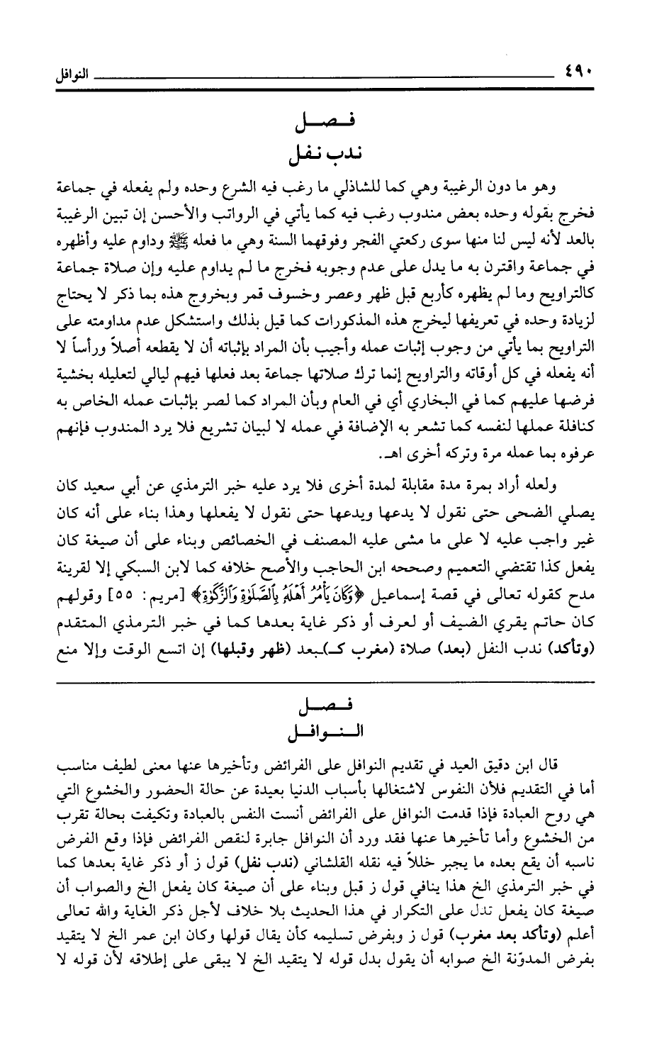 قال ابن دقيق العيد في تقديم النوافل على الفرائض وتأخيرها عنها معنى لطيف مناسب أما في التقديم فلأن النفوس لاشتغالها بأسباب الدنيا بعيدة عن حالة الحضور والخشوع التي هي روح العبادة فإذا قدمت النوافل على الفرائض أنست النفس بالعبادة وتكيفت بحالة تقرب من الخشوع وأما تأخيرها عنها فقد ورد أن النوافل جابرة لنقص الفرائض فإذا وقع الفرض ناسبه أن يقع بعده ما يجبر خللًا فيه نقله القلشاني (ندب نفل) فول ز أو ذكر غاية بعدها كما في خبر الترمذي الخ هذا ينافي قول ز قبل وبناء على أن صيغة كان يفعل الخ والصواب أن صيغة كان يفعل تدل على التكرار في هذا الحديث بلا خلاف لأجل ذكر الغاية والله تعالى أعلم (وتأكد بعد مغرب) قول ز وبفرض تسليمه كأن يقال قولها وكان ابن عمر الخ لا يتقيد بفرض المدوّنة الخ صوابه أن يقول بدل قوله لا يتقيد الخ لا يبقى على إطلاقه لأن قوله لا
