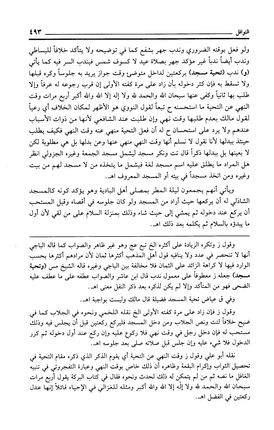 ولو فعل بوقته الضروري وندب جهر بشفع كما في توضيحه ولا يتأكد خلافًا للبساطي وندب أيضًا ندبًا غير مؤكد جهر بصلاة عيد لا كسوف شمس فيندب السر فيه كما يأتي (و) ندب (تحية مسجد) بركعتين لداخل متوضئ وقت جواز يريد به جلوسًا وكره قبلها ولا تسقط به فإن كثر دخوله بأن زاد على مرة كفته الأولى إن قرب رجوعه له عرفًا وإلا طلب بها ثانيًا وكفى عنها سبحان الله والحمد لله ولا إله إلا الله والله أكبر أربع مرات وقت النهي عن التحية ما استحسنه ح تبعًا لقول النووي هو الأظهر لمكان الخلاف أي رعيًا لقول مالك بعدم طلبها وقت نهي وإن طلبت عند الشافعي لأنها من ذوات الأسباب عندهم ولا يرد على استحسان ح له أن فعل التحية منهي عنه وقت النهي فكيف يطلب حينئذ ببدلها لأنا نقول لا نسلم أنها وقت النهي منهي عنها وعن بدلها بل هي مطلوبة لكن لا بعينها بل ببدلها ذكرًا قال تت ونكر مسجد ليشمل مسجد الجمعة وغيره الجزولي انظر هل المراد ما يطلق عليه اسم مسجد لغة فيشمل ما يتخذه من لا مسجد لهم من بيت وغيره ومن اتخذ مسجدًا في بيته أو المسجد المعروف اهـ.