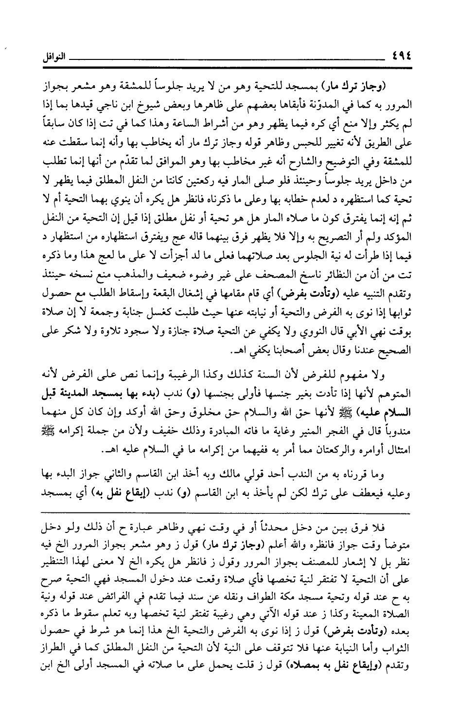 (وجاز ترك مار) بمسجد للتحية وهو من لا يريد جلوسًا للمشقة وهو مشعر بجواز المرور به كما في المدوّنة فأبقاها بعضهم على ظاهرها وبعض شيوخ ابن ناجي قيدها بما إذا لم يكثر وإلا منع أي كره فيما يظهر وهو من أشراط الساعة وهذا كما في تت إذا كان سابقًا على الطريق لأنه تغيير للحبس وظاهر قوله وجاز ترك مار أنه يخاطب بها وأنه إنما سقطت عنه للمشقة وفي التوضيح والشارح أنه غير مخاطب بها وهو الموافق لما تقدّم من أنها إنما تطلب من داخل يريد جلوسًا وحينئذ فلو صلى المار فيه ركعتين كانتا من النفل المطلق فيما يظهر لا تحية كما استظهره د لعدم خطابه بها وعلى ما ذكرناه فانظر هل يكره أن ينوي بهما التحية أم لا ثم إنه إنما يفترق كون ما صلاه المار هل هو تحية أو نفل مطلق إذا قيل إن التحية من النفل المؤكد ولم أر التصريح به وإلا فلا يظهر فرق بينهما قاله عج ويفترق استظهاره من استظهار د فيما إذا طرأت له نية الجلوس بعد صلاتهما فعلى ما لد أجزأت لا على ما لعج هذا وما ذكره تت من أن من النظائر ناسخ المصحف على غير وضوء ضعيف والمذهب منع نسخه حينئذ وتقدم التنبيه عليه (وتأدت بفرض) أي قام مقامها في إشغال البقعة وإسقاط الطلب مع حصول ثوابها إذا نوى به الفرض والتحية أو نيابته عنها حيث طلبت كغسل جنابة وجمعة لا إن صلاة بوقت نهي الأبي قال النووي ولا يكفي عن التحية صلاة جنازة ولا سجود تلاوة ولا شكر على الصحيح عندنا وقال بعض أصحابنا يكفي اهـ.