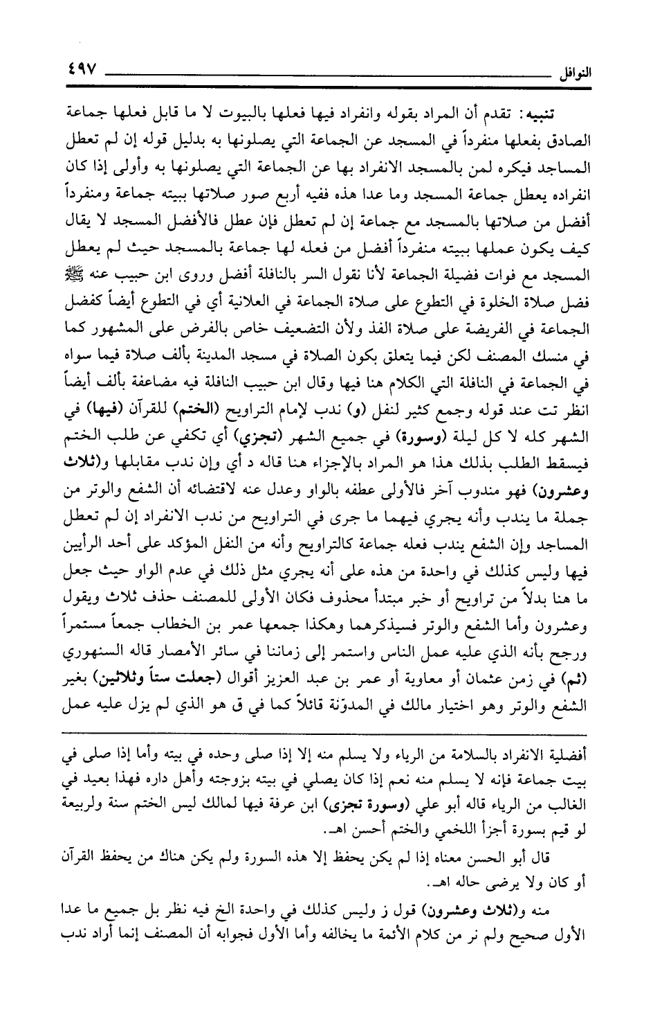 أفضلية الانفراد بالسلامة من الرياء ولا يسلم منه إلا إذا صلى وحده في بيته وأما إذا صلى في بيت جماعة فإنه لا يسلم منه نعم إذا كان يصلي في بيته بزوجته وأهل داره فهذا بعيد في الغالب من الرياء قاله أبو علي (وسورة تجزى) ابن عرفة فيها لمالك ليس الختم سنة ولربيعة لو قيم بسورة أجزأ اللخمي والختم أحسن اهـ.