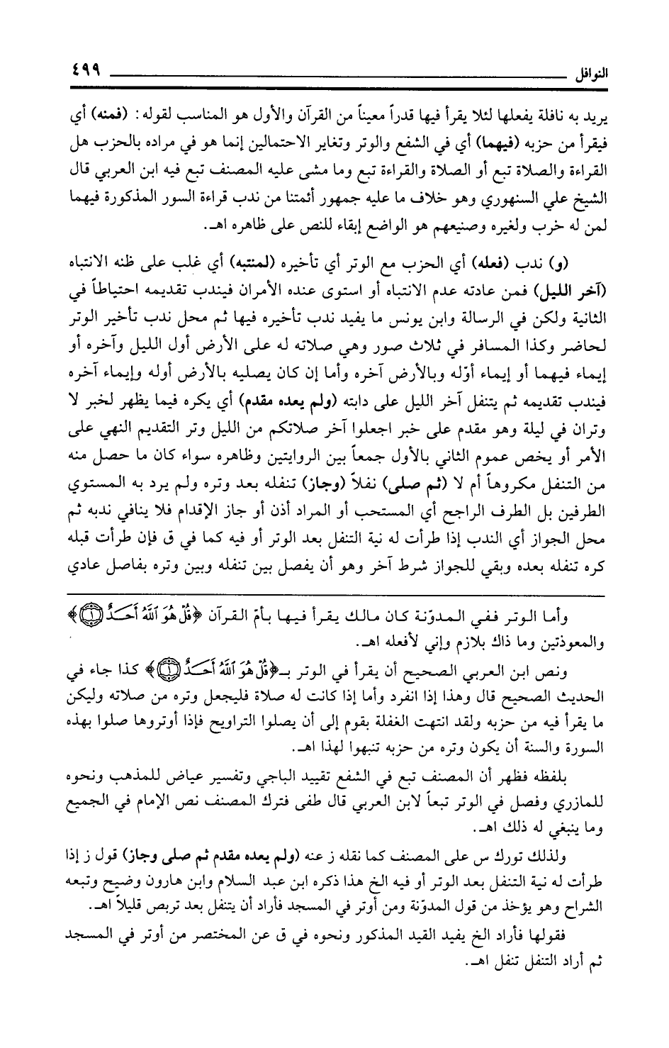 ونص ابن العربي الصحيح أن يقرأ في الوتر بـ {قُلْ هُوَ اللَّهُ أَحَدٌ (1)} كذا جاء في الحديث الصحيح قال وهذا إذا انفرد وأما إذا كانت له صلاة فليجعل وتره من صلاته وليكن ما يقرأ فيه من حزبه ولقد انتهت الغفلة بقوم إلى أن يصلوا التراويح فإذا أوتروها صلوا بهذه السورة والسنة أن يكون وتره من حزبه تنبهوا لهذا اهـ.