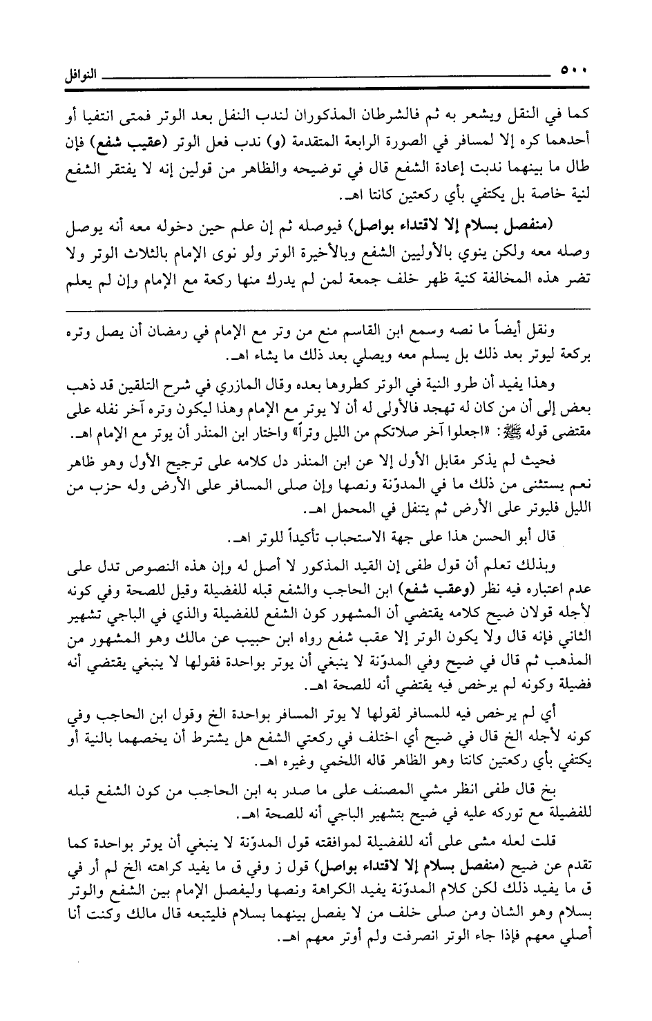 ونقل أيضًا ما نصه وسمع ابن القاسم منع من وتر مع الإمام في رمضان أن يصل وتره بركعة ليوتر بعد ذلك بل يسلم معه ويصلي بعد ذلك ما يشاء اهـ.