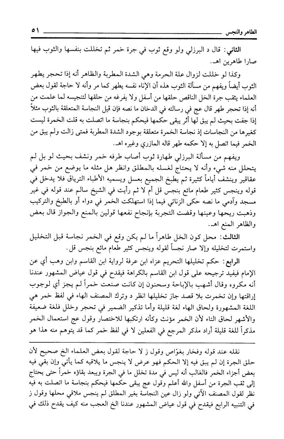 الثاني: قال د البرزلي ولو وقع ثوب في جرة خمر ثم تخللت بنفسها والثوب فيها صارا طاهرين اهـ.