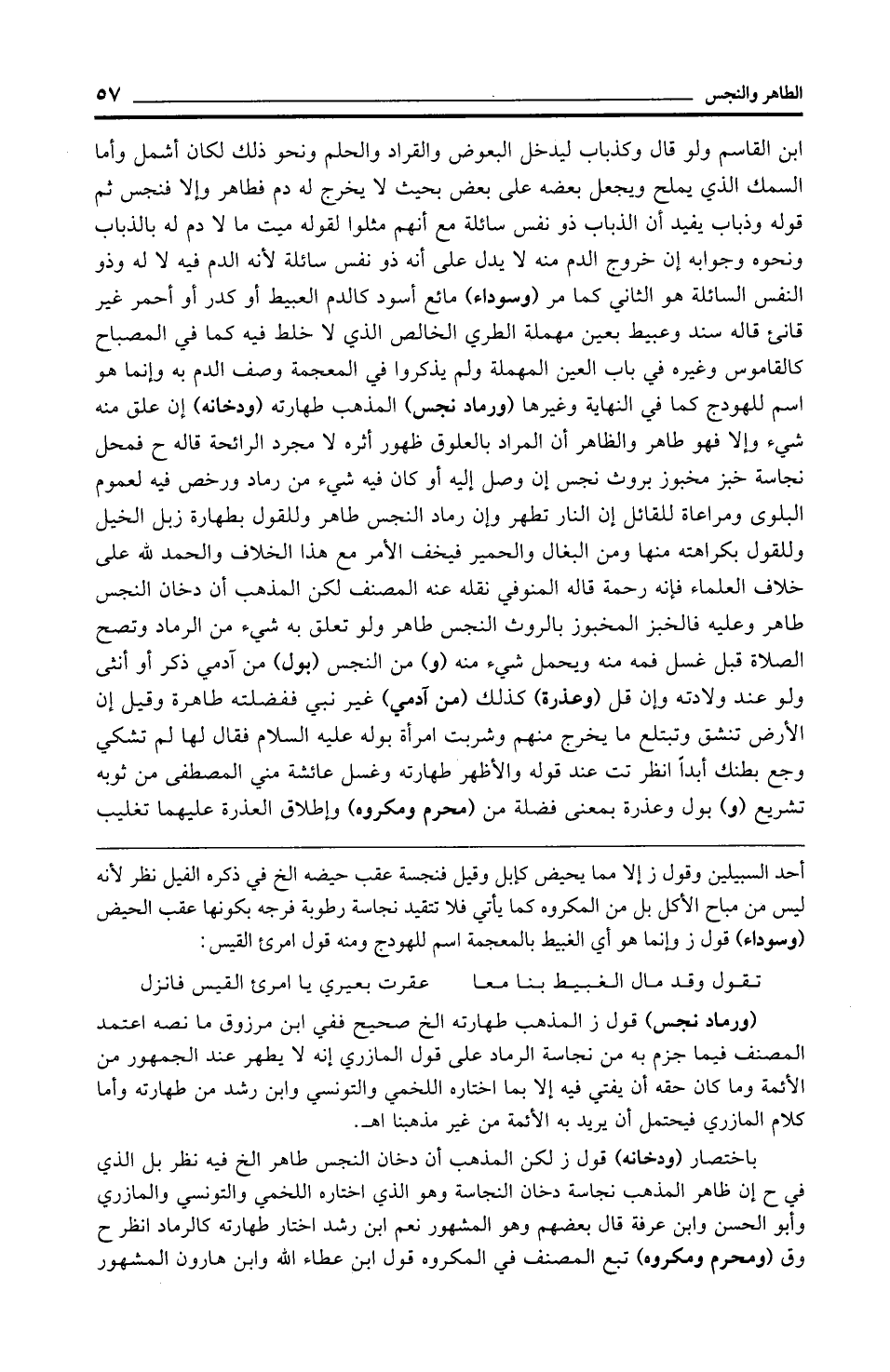 ابن القاسم ولو قال وكذباب ليدخل البعوض والقراد والحلم ونحو ذلك لكان أشمل وأما السمك الذي يملح ويجعل بعضه على بعض بحيث لا يخرج له دم فطاهر وإلا فنجس ثم قوله وذباب يفيد أن الذباب ذو نفس سائلة مع أنهم مثلوا لقوله ميت ما لا دم له بالذباب ونحوه وجوابه إن خروج الدم منه لا يدل على أنه ذو نفس سائلة لأنه الدم فيه لا له وذو النفس السائلة هو الثاني كما مر (وسوداء) مائع أسود كالدم العبيط أو كدر أو أحمر غير قانئ قاله سند وعبيط بعين مهملة الطبري الخالص الذي لا خلط فيه كما في المصباح كالقاموس وغيره في باب العين المهملة ولم يذكروا في المعجمة وصف الدم به وإنما هو اسم للهودج كما في النهاية وغيرها (ورماد نجس) المذهب طهارته (ودخانه) إن علق منه شيء وإلا فهو طاهر والظاهر أن المراد بالعلوق ظهور أثره لا مجرد الرائحة قاله ح فصل نجاسة خبز مخبوز بروث نجس إن وصل إليه أو كان فيه شيء من رماد ورخص فيه لعموم البلوى ومراعاة للقائل إن النار تطهر وإن رماد النجس طاهر وللقول بطهارة زبل الخيل وللقول بكراهته منها ومن البغال والحمير فيخف الأمر مع هذا الخلاف والحمد لله على خلاف العلماء فإنه رحمة قاله المنوفي نقله عنه المصنف لكن المذهب أن دخان النجس طاهر وعليه فالخبز المخبوز بالروث النجس طاهر ولو تعلق به شيء من الرماد وتصح الصلاة قبل غسل فمه منه ويحمل شيء منه (و) من النجس (بول) من آدمي ذكر أو أنثى ولو عند ولادته وإن قل (وعذرة) كذلك (من آدمي) غير نبي ففضلته طاهرة وقيل إن الأرض تنشق وتبتلع ما يخرج منهم وشربت امرأة بوله عليه السلام فقال لها لم تشكي وجع بطنك أبدًا انظر تت عند قوله والأظهر طهارته وغسل عائشة مني المصطفى من ثوبه تشريع (و) بول وعذرة بمعنى فضلة من (محرم ومكروه) وإطلاق العذرة عليهما تغليب