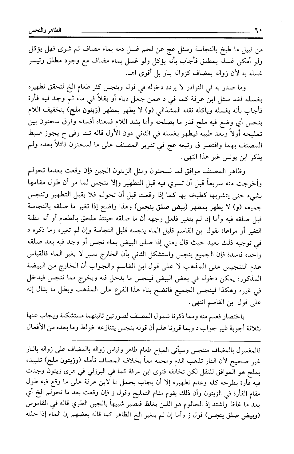من قبيل ماطبخ بالنجاسة وسئل عج عن لحم غسل دمه بماء مضاف ثم شوى فهل يؤكل ولو أمكن غسله بمطلق فأجاب بأنه يؤكل ولو غسل بماء مضاف مع وجود مطلق وتيسر غسله به لأن زواله بمضاف كزواله بنار بل أقوى اهـ.