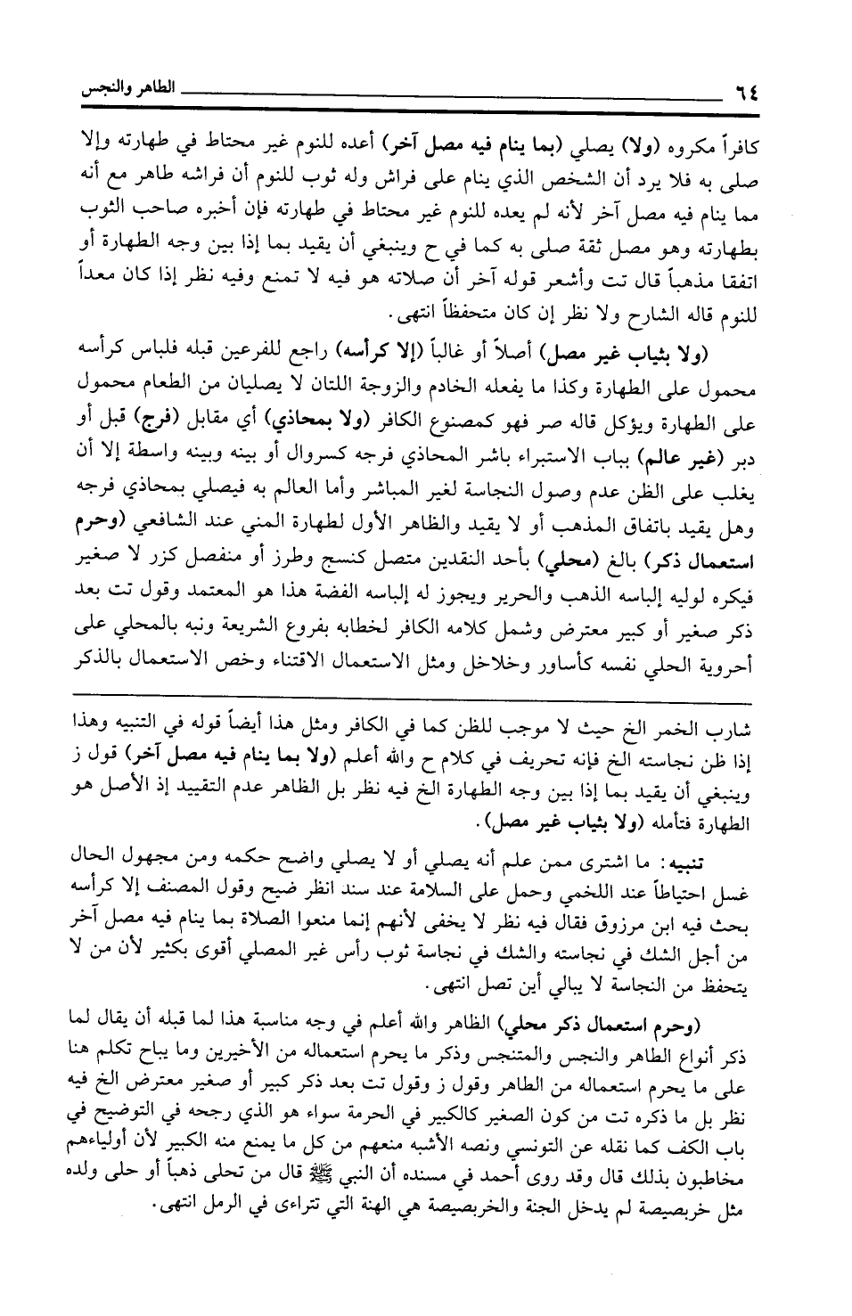 (ولا بثياب غير مصل) أصلًا أو غالبًا (إلا كرأسه) راجع للفرعين قبله فلباس كرأسه محمول على الطهارة وكذا ما يفعله الخادم والزوجة اللتان لا يصليان من الطعام محمول على الطهارة ويؤكل قاله صر فهو كمصنوع الكافر (ولا بمحاذي) أي مقابل (فرج) قبل أو دبر (غير عالم) بباب الاستبراء باشر المحاذي فرجه كسروال أو بينه وبينه واسطة إلا أن يغلب على الظن عدم وصول النجاسة لغير المباشر وأما العالم به فيصلي بمحاذي فرجه وهل يقيد باتفاق المذهب أو لا يقيد والظاهر الأول لطهارة المني عند الشافعي (وحرم استعمال ذكر) بالغ (محلي) بأحد النقدين متصل كنسج وطرز أو منفصل كزر لا صغير فيكره لوليه إلباسه الذهب والحرير ويجوز له إلباسه الفضة هذا هو المعتمد وقول تت بعد ذكر صغير أو كبير معترض وشمل كلامه الكافر لخطابه بفروع الشريعة ونبه بالمحلي على أحروية الحلي نفسه كأساور وخلاخل ومثل الاستعمال الاقتناء وخص الاستعمال بالذكر