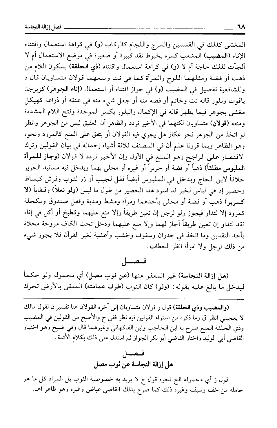 المغشى كذلك في القسمين والسرج واللجام كالركاب (و) في كراهة استعمال واقتناء الإناء (المضبب) المشعب كسره بخيوط نقد كبيرة أو صغيرة في موضع الاستعمال أم لا ألجأت لذلك حاجة أم لا (و) في كراهة استعمال واقتناء (ذي الحلقة) بسكون اللام من ذهب أو فضة ومثلهما اللوح والمرآة كما في تت ومنعهما قولان متساويان قال د وللشافعية تفصيل في المضبب (و) في جواز اقتناء أو استعمال (إناء الجوهر) كزبرجد ياقوت وبلور قاله تت وخاتم أو فصه منه أو جعل شيء منه في عنقه أو ذراعه كهيكل مغشى بجوهر فيما يظهر قاله في الإكمال والبلور بكسر الموحدة وفتح اللام المشددة ومنعه (قولان) متساويان لكنهما في الأخير تردد والظاهر أن العقيق ليس من الجوهر وانظر لو اتخذ من الجوهر نحو عكاز هل يجري فيه القولان أو يتفق على المنع كالمرود ونحوه وهو الظاهر وبما قررنا علم أن في المصنف ثلاثة أشياء إجماله في بيان القولين وترك الاقتصار على الراجح وهو المنع في الأول وإن الأخير تردد لا قولان (وجاز للمرأة الملبوس مطلقًا) ذهبًا أو فضة أو حريرًا أو غيره أو محلى بهما ويدخل فيه مسانيد الحرير خلافًا لابن الحاج ويدخل في الملبوس أيضًا قفل لجيب أو زر لثوب وفرش كبساط وحصير إذ هي لباس لخبر قد اسود هذا الحصير من طول ما لبس (ولو نعلًا) وقبقابًا (لا كسرير) ذهب أو فضة أو محلى بأحدهما ومرآة ومشط ومدية وقفل صندوق ومكحلة كمرود إلا لتداو فيجوز ولو لرجل إن تعين طريقًا وإلا منع عليهما وكطبخ أو أكل في إناء نقد لتداو إن تعين طريقًا أجاز لهما وإلا منع عليهما ودخل تحت الكاف مروحة محلاة بأحد النقدين وما اتخذ في جدران وسقوف وخشب وأغشية لغير القران فلا يجوز شيء من ذلك لرجل ولا امرأة انظر الحطاب.