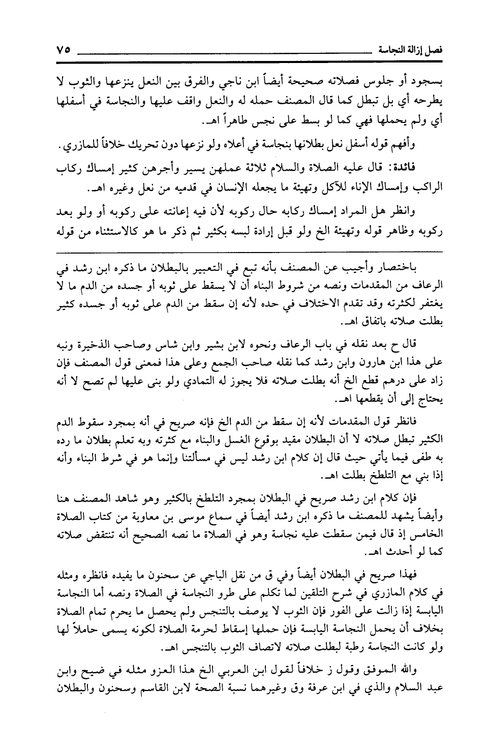 فإن كلام ابن رشد صريح في البطلان بمجرد التلطخ بالكثير وهو شاهد المصنف هنا وأيضًا يشهد للمصنف ما ذكره ابن رشد أيضًا في سماع موسى بن معاوية من كتاب الصلاة الخامس إذ قال فيمن سقطت عليه نجاسة وهو في الصلاة ما نصه الصحيح أنه تنتقض صلاته كما لو أحدث اهـ.