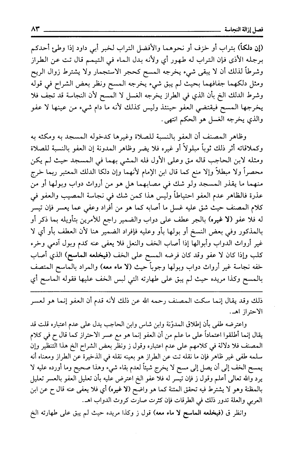 واعترضه طفى بأن إطلاق المدوّنة وابن شاس وابن الحاجب يدل على عدم اعتباره قلت قد يقال إنما أطلقوا اعتمادًا على ما علم من أن العفو إنما هو مع عسر الاحتراز كما قال ح في كلام المصنف فلا دلالة في كلامهم على عدم اعتباره وقول ز ونظر بعض الشراح الخ هذا التنظير وإن سلمه طفى غير ظاهر فإن ما نقله تت عن الطراز هو بعينه نقله في الذخيرة عن الطراز ومعناه أنه يمسح الخف إلى أن يصل إلى مسح لا يخرج شيئًا لعدم بقاء شيء وهذا صحيح وما أورده عليه لا يرد والله تعالى أعلم وقول ز فإن تيسر له فلا عفو الخ اعترض عليه بأن تعليل العفو بالعسر تعليل بالمظنة وهو لا يشترط فيه تحقق المئنة كما هو واضح (لا غيره) أي فلا يعفى عنه قال ح عن ابن العربي والعلة تدور ذلك في الطرقات فإن كثرت صارت كروث الدواب اهـ.