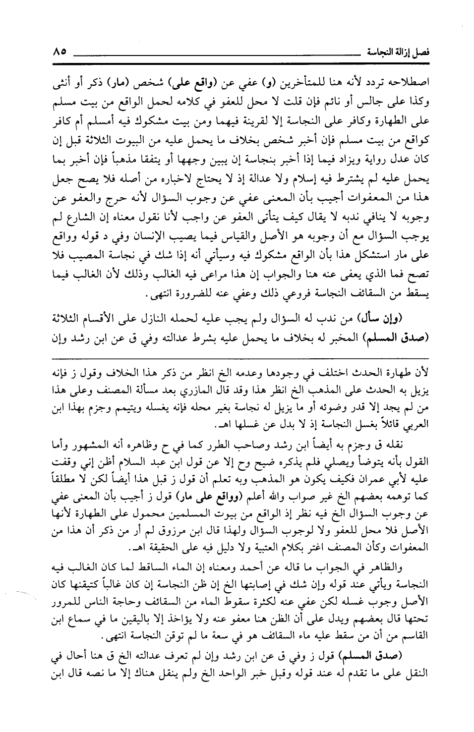 اصطلاحه تردد لأنه هنا للمتأخرين (و) عفي عن (واقع على) شخص (مار) ذكر أو أنثى وكذا على جالس أو نائم فإن قلت لا محل للعفو في كلامه لحمل الواقع من بيت مسلم على الطهارة وكافر على النجاسة إلا لقرينة فيهما ومن بيت مشكوك فيه أمسلم أم كافر كواقع من بيت مسلم فإن أخبر شخص بخلاف ما يحمل عليه من البيوت الثلاثة قبل إن كان عدل رواية ويزاد فيما إذا أخبر بنجاسة إن يبين وجهها أو يتفقا مذهبًا فإن أخبر بما يحمل عليه لم يشترط فيه إسلام ولا عدالة إذ لا يحتاج لإخباره من أصله فلا يصح جعل هذا من المعفوات أجيب بأن المعنى عفي عن وجوب السؤال لأنه حرج والعفو عن وجوبه لا ينافي ندبه لا يقال كيف يتأتى العفو عن واجب لأنا نقول معناه إن الشارع لم يوجب السؤال مع أن وجوبه هو الأصل والقياس فيما يصيب الإنسان وفي د قوله وواقع على مار استشكل هذا بأن الواقع مشكوك فيه وسيأتي أنه إذا شك في نجاسة المصيب فلا تصح فما الذي يعفى عنه هنا والجواب إن هذا مراعى فيه الغالب وذلك لأن الغالب فيما يسقط من السقائف النجاسة فروعي ذلك وعفي عنه للضرورة انتهى.