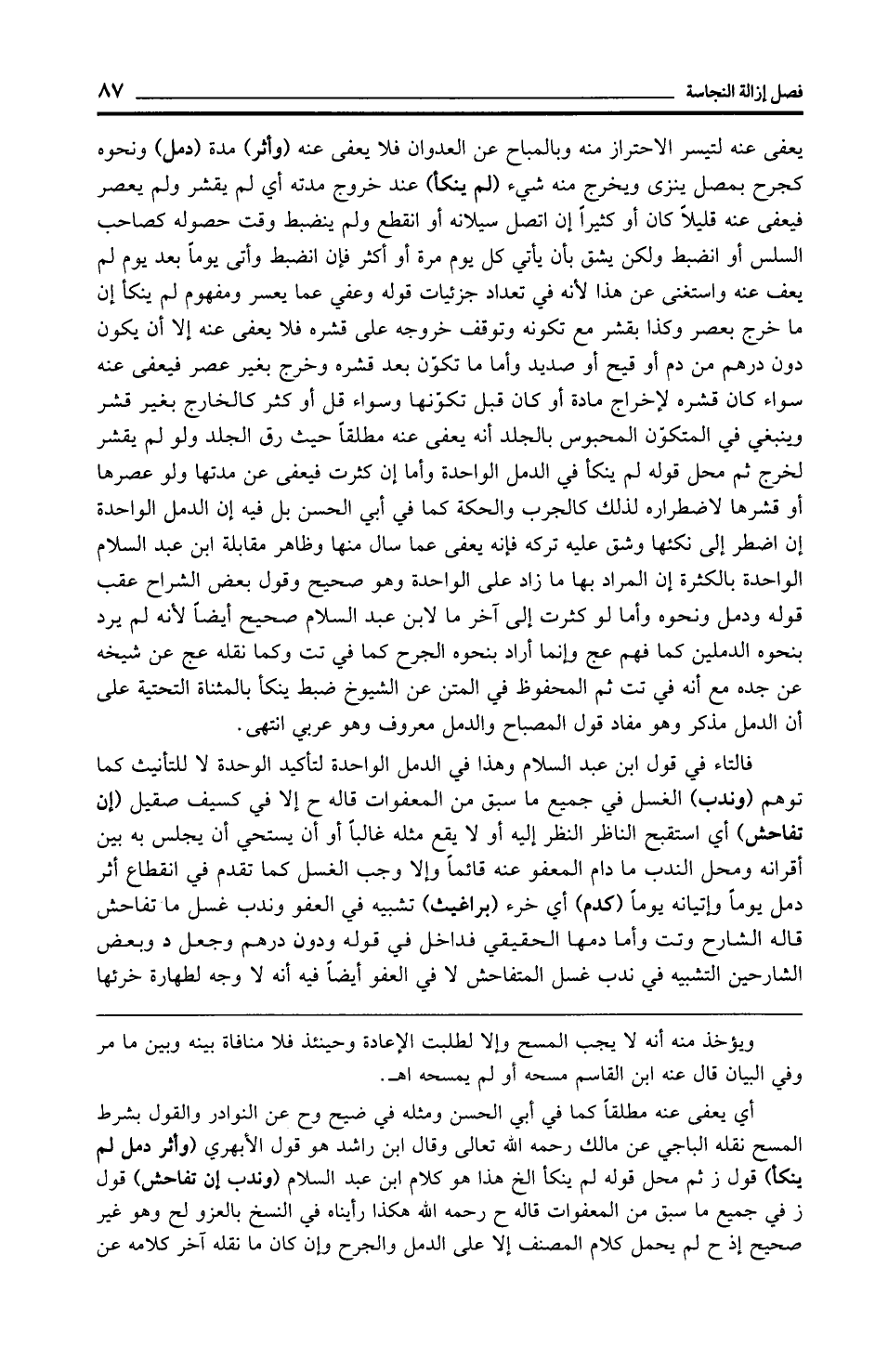 أي يعفى عنه مطلقًا كما في أبي الحسن ومثله في ضيح وح عن النوادر والقول بشرط المسح نقله الباجي عن مالك رحمه الله تعالى وقال ابن راشد هو قول الأبهري (وأثر دمل لم ينكأ) قول ز ثم محل قوله لم ينكأ الخ هذا هو كلام ابن عبد السلام (وندب إن تفاحش) قول ز في جميع ما سبق من المعفوات قاله ح رحمه الله هكذا رأيناه في النسخ بالعزو لح وهو غير صحيح إذ ح لم يحمل كلام المصنف إلا على الدمل والجرح وإن كان ما نقله آخر كلامه عن