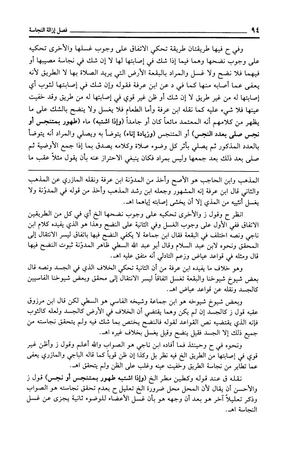 وبعض شيوخ شيوخه هو ابن جماعة وشيخه الفاسي هو السطي لكن قال ابن مرزوق عقبه قول ز كالجسد إن لم يكن وهما يقتضي أن الخلاف في الأرض كالجسد ولعله كالثوب فإنه الذي يقتضيه نص القواعد لقوله فالنضح يختص بما شك فيه ولم يتحقق نجاسته من جميع ذلك إلا الجسد فقيل ينضح وقيل يغسل بخلاف غيره اهـ.