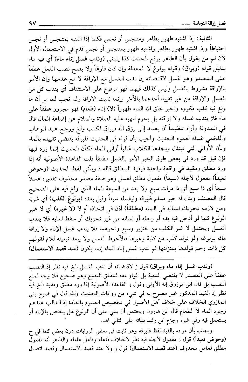 ويجاب بأن مراده بالقيد لفظ فليرقه وهو ثابت في بعض الروايات دون بعض كما في ح (وحوض تعبدًا) قول ز مفعول لأجله فيه نظر لاختلاف فاعله وفاعل عامله والظاهر أنه مفعول مطلق لعامل محذوف (عند قصد الاستعمال) قول ز ولا عند قصد الاستعمال وقصد اتصال