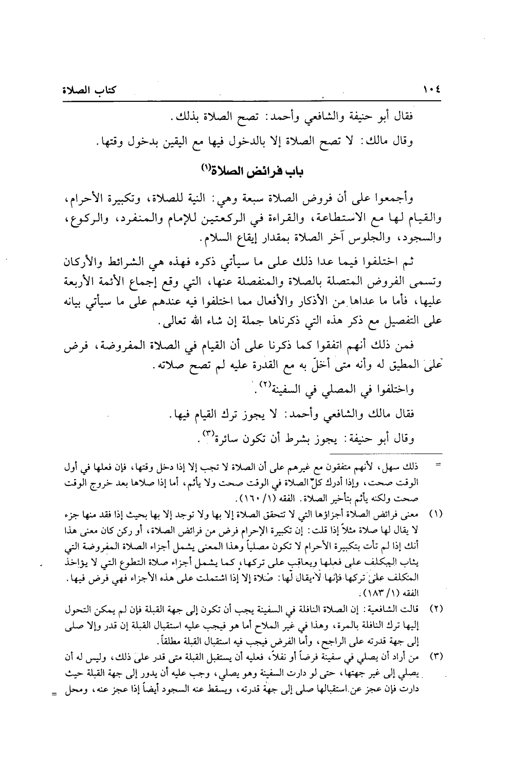 ثمَّ اخْتلفُوا فِيمَا عدا ذَلِك على مَا سَيَأْتِي ذكره فَهَذِهِ هِيَ الشَّرَائِط والأركان وَتسَمى الْفُرُوض الْمُتَّصِلَة بِالصَّلَاةِ والمنفصلة عَنْهَا، الَّتِي وَقع إِجْمَاع الْأَئِمَّة الْأَرْبَعَة عَلَيْهَا، فَأَما مَا عَداهَا من الْأَذْكَار وَالْأَفْعَال مِمَّا اخْتلفُوا فِيهِ عِنْدهم على مَا سَيَأْتِي بَيَانه على التَّفْصِيل مَعَ ذكر هَذِه الَّتِي ذَكرنَاهَا جملَة إِن شَاءَ اللَّهِ تَعَالَى.