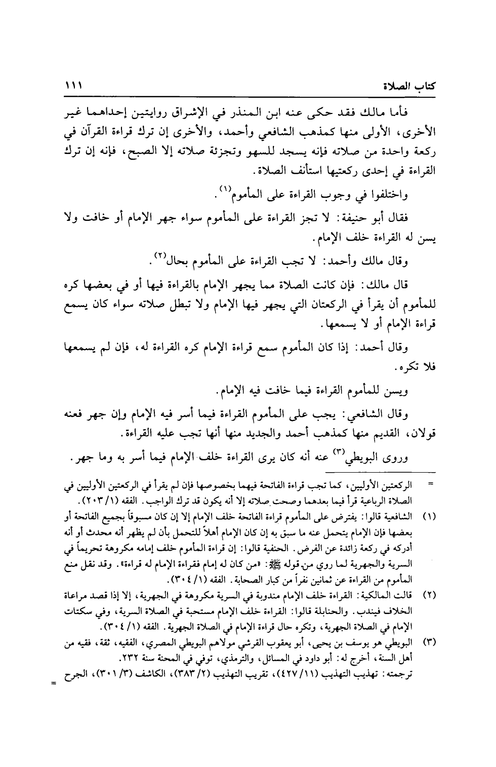 وروى الْبُوَيْطِيّ عَنهُ أَنه كَانَ يرى الْقِرَاءَة خلف الإِمَام فِيمَا أسر بِهِ وَمَا جهر.