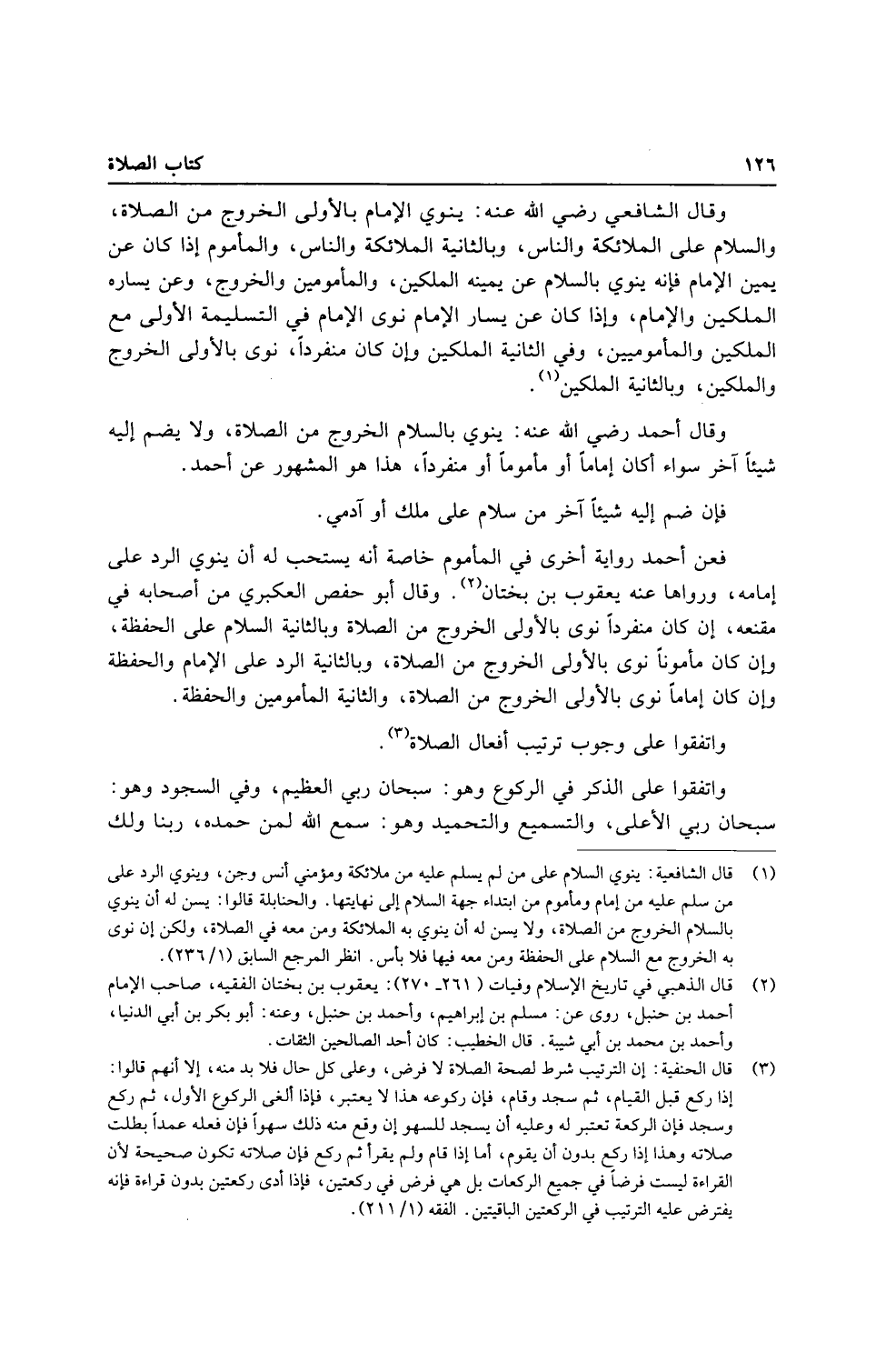 وَقَالَ الشَّافِعِي رَضِي اللَّهِ عَنهُ: يَنْوِي الإِمَام بِالْأولَى الْخُرُوج من الصَّلَاة، وَالسَّلَام على الْمَلَائِكَة وَالنَّاس، وبالثانية الْمَلَائِكَة وَالنَّاس، وَالْمَأْمُوم إِذا كَانَ عَن يَمِين الإِمَام فَإِنَّهُ ينوى بِالسَّلَامِ عَن يَمِينه الْملكَيْنِ، والمأمومين وَالْخُرُوج، وَعَن يسَاره الْملكَيْنِ وَالْإِمَام، وَإِذا كَانَ عَن يسَار الإِمَام نوى الإِمَام فِي التسليمة الأولى مَعَ الْملكَيْنِ والمأموميين، وَفِي الثَّانِيَة الْملكَيْنِ وَإِن كَانَ مُنْفَردا، نوى بِالْأولَى الْخُرُوج والملكين، بِالثَّانِيَةِ الْملكَيْنِ.