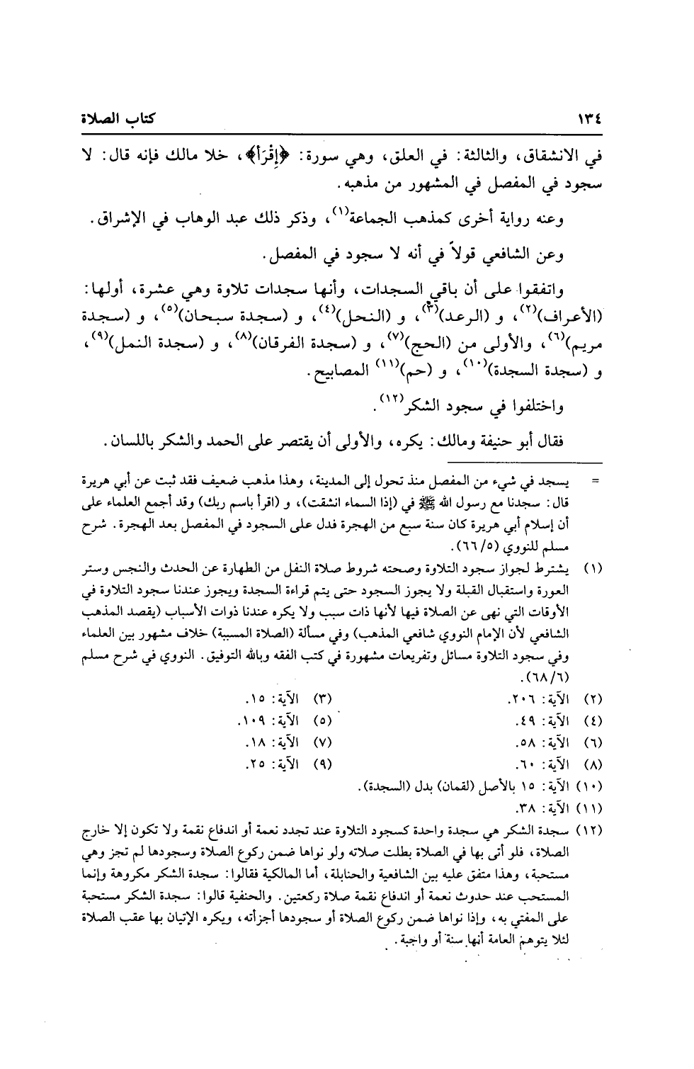 فِي الانشقاق، وَالثَّالِثَة: فِي العلق، وَهِي سُورَة: {اقْرَأ} ، خلا مَالك فَإِنَّهُ قَالَ: لَا سُجُود فِي الْمفصل فِي الْمَشْهُور من مذْهبه.