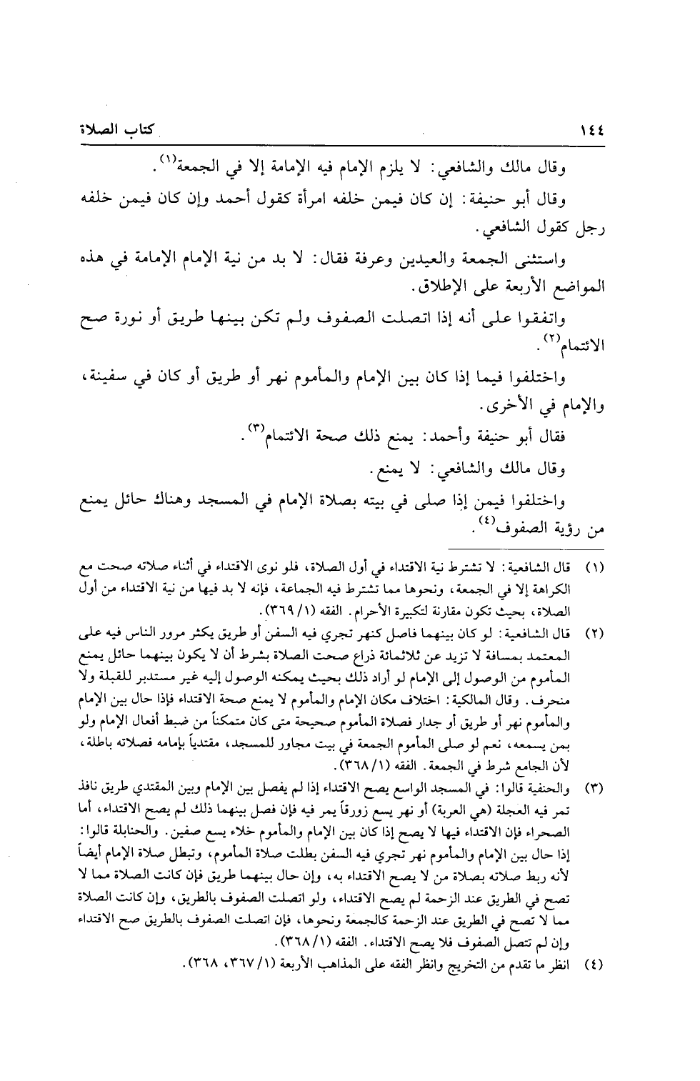 وَاسْتثنى الْجُمُعَة وَالْعِيدَيْنِ وعرفة فَقَالَ: لَا بُد من نِيَّة الإِمَام الْإِمَامَة فِي هَذِه الْمَوَاضِع الْأَرْبَعَة على الْإِطْلَاق.