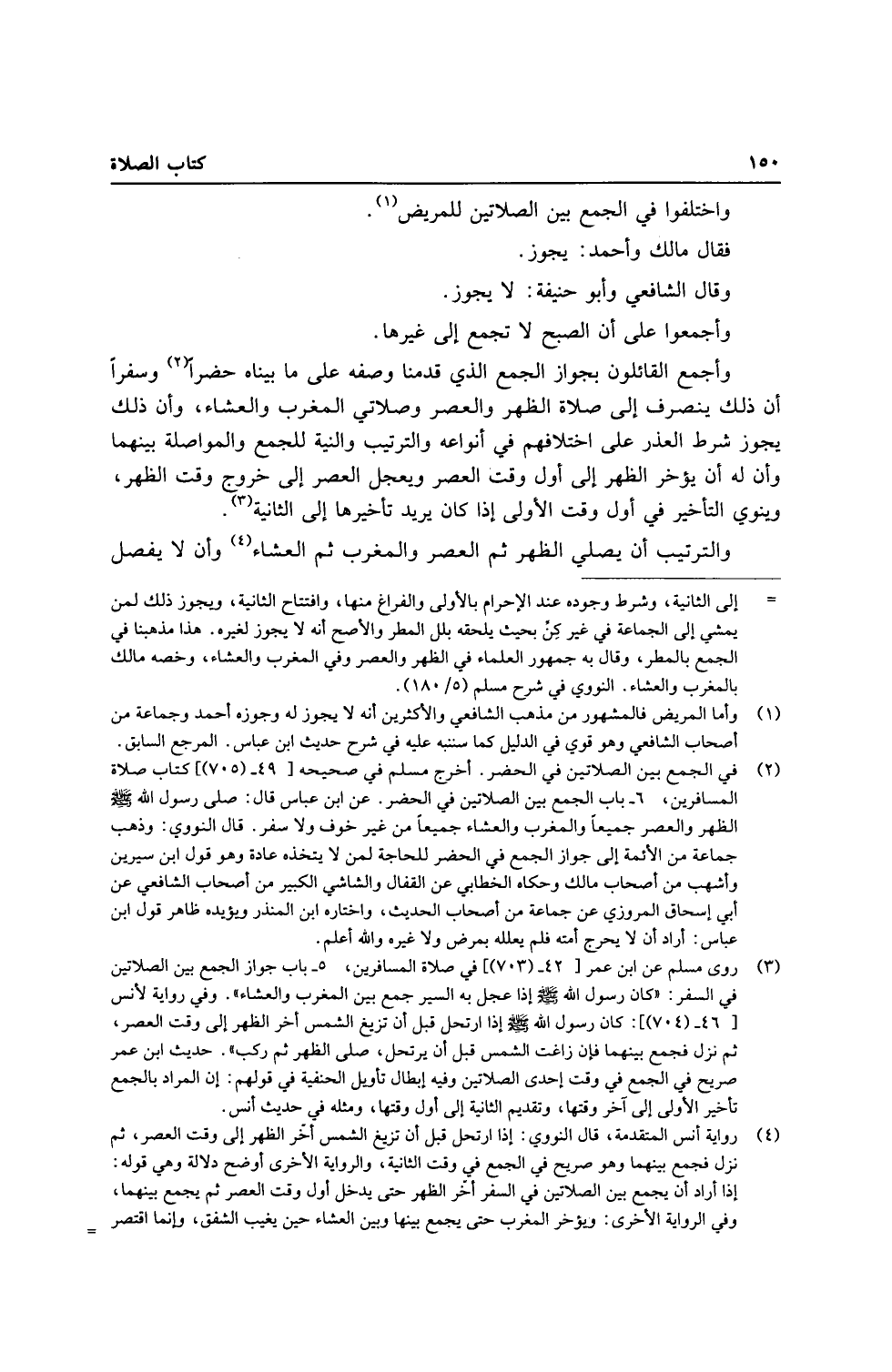 وَأجْمع الْقَائِلُونَ بِجَوَاز الْجمع الَّذِي قدمنَا وَصفه على مَا بَيناهُ حضرا وسفرا أَن ذَلِك ينْصَرف إِلَى صَلَاة الظّهْر وَالْعصر وصلاتي الْمغرب وَالْعشَاء، وَأَن ذَلِك يجوز شَرط الْعذر على اخْتلَافهمْ فِي أَنْوَاعه وَالتَّرْتِيب وَالنِّيَّة للْجمع والمواصلة بَينهمَا وَأَن لَهُ أَن يُؤَخر الظّهْر إِلَى أول وَقت الْعَصْر ويعجل الْعَصْر إِلَى خُرُوج وَقت الظّهْر، وَيَنْوِي التَّأْخِير فِي أول وَقت الأولى إِذا كَانَ يُرِيد تَأْخِيرهَا إِلَى الثَّانِيَة.