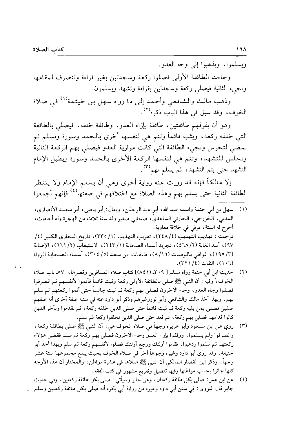 إِلَّا مَالِكًا فَإِنَّهُ قد رويت عَنهُ رِوَايَة أُخْرَى وَهِي أَن يسلم الإِمَام وَلَا ينْتَظر الطَّائِفَة الثَّانِيَة حَتَّى يسلم بهم وَهَذِه الصَّلَاة مَعَ اخْتلَافهمْ فِي صفتهَا فَإِنَّهُم أَجمعُوا