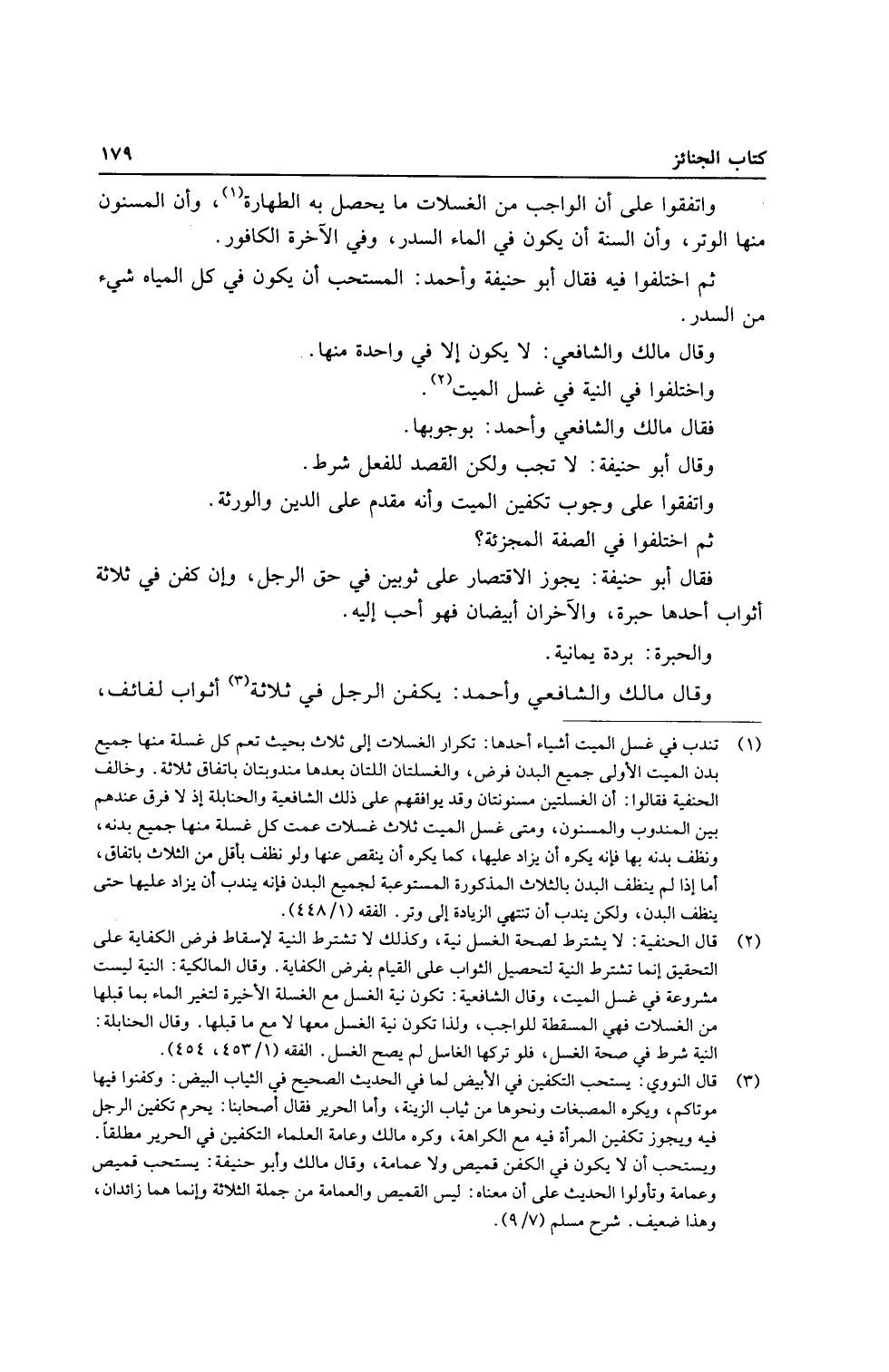 وَاتَّفَقُوا على أَن الْوَاجِب من الغسلات مَا يحصل بِهِ الطَّهَارَة، وَأَن الْمسنون مِنْهَا الْوتر وَأَن السّنة أَن يكون فِي المَاء السدر، وَفِي الْآخِرَة الكافور.