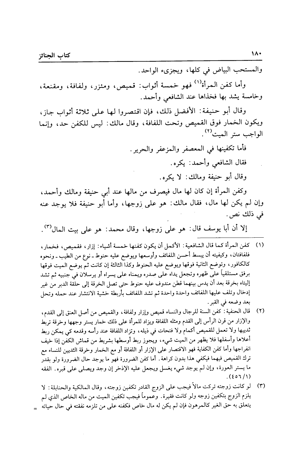 وكفن الْمَرْأَة إِن كَانَ لَهَا مَال فَيصْرف من مَالهَا عِنْد أبي حنيفَة وَمَالك وَأحمد، وَإِن لم يكن لَهَا مَال: فَقَالَ مَالك: هُوَ على زَوجهَا، وَأما أَبُو حنيفَة فَلَا يُوجد عَنهُ فِي ذَلِك نَص.