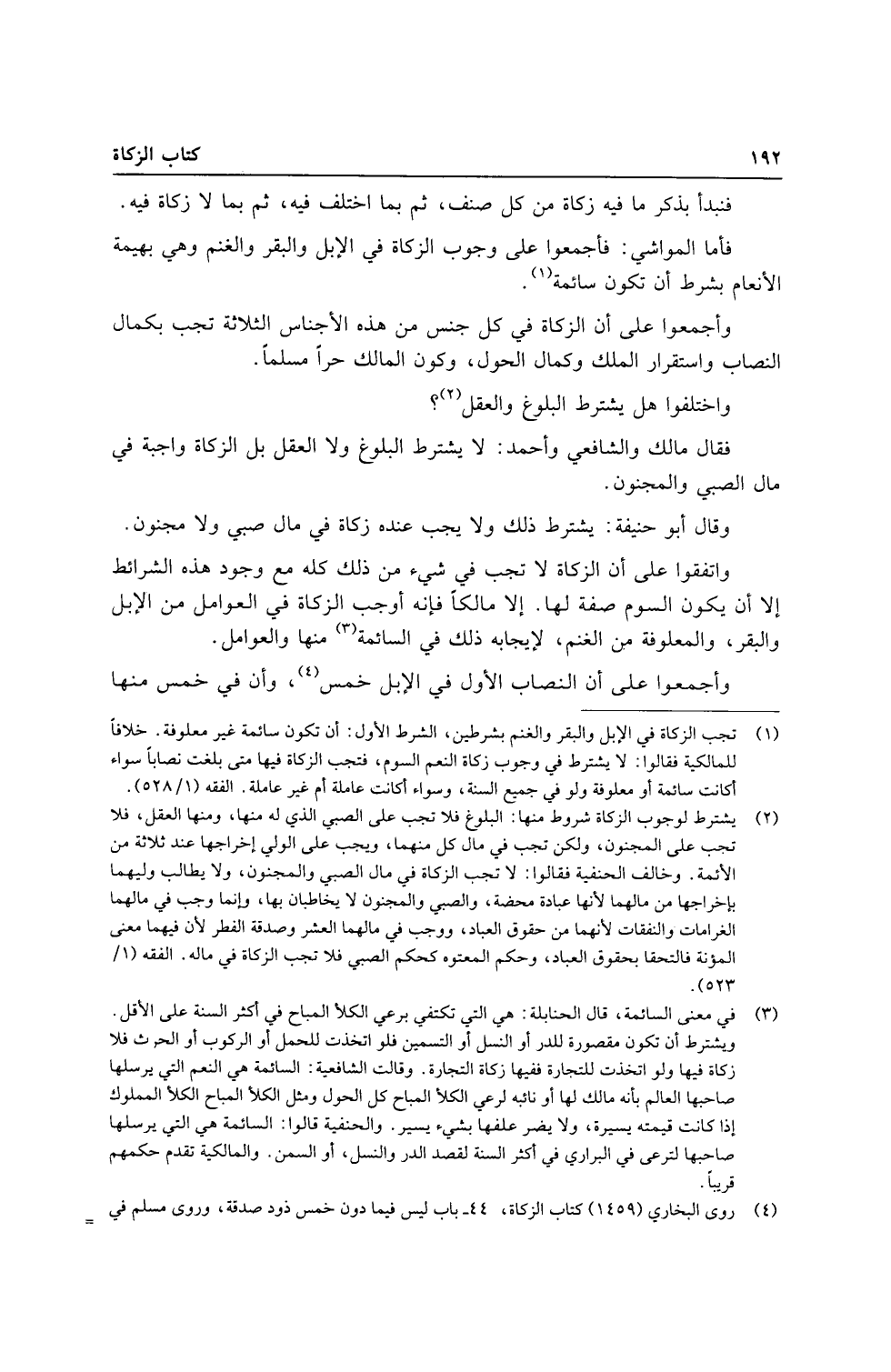 وَاتَّفَقُوا على أَن الزَّكَاة لَا تجب فِي شَيْء من ذَلِك كُله مَعَ وجود هَذِه الشَّرَائِط إِلَّا أَن يكون السّوم صفة لَهَا. إِلَّا مَالِكًا فَإِنَّهُ أوجب الزَّكَاة فِي العوامل من الْإِبِل وَالْبَقر، والمعلوفة من الْغنم، لإيجابة ذَلِك فِي السَّائِمَة مِنْهَا والعوامل.