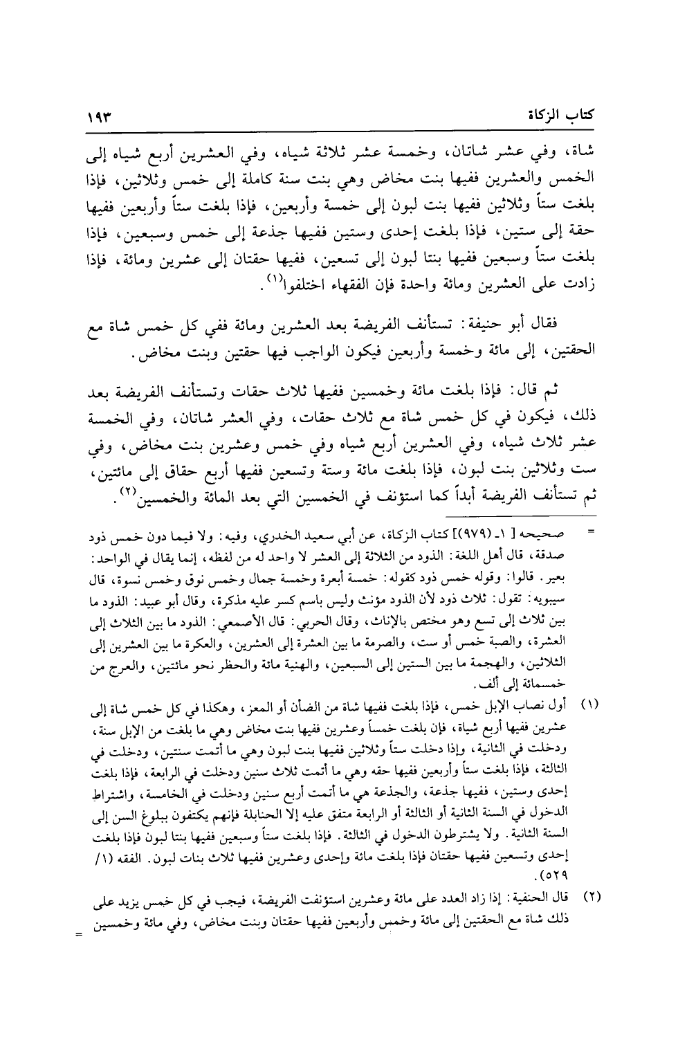 ثمَّ قَالَ: فَإِذا بلغت مائَة وَخمسين فَفِيهَا ثَلَاث حقات وتستأنف الْفَرِيضَة بعد ذَلِك، فَيكون فِي كل خمس شَاة مَعَ ثَلَاث حقات، وَفِي الْعشْر شَاتَان، وَفِي الْخَمْسَة عشر ثَلَاث شِيَاه، وَفِي الْعشْرين أَربع شِيَاه وَفِي خمس وَعشْرين بنت مَخَاض، وَفِي سِتّ وَثَلَاثِينَ بنت لبون، فَإِذا بلغت مائَة وَسِتَّة وَتِسْعين فَفِيهَا أَربع حقاق إِلَى مِائَتَيْنِ، ثمَّ تسْتَأْنف الْفَرِيضَة أبدا كَمَا استؤنف فِي الْخمسين الَّتِي بعد الْمِائَة وَالْخمسين.
