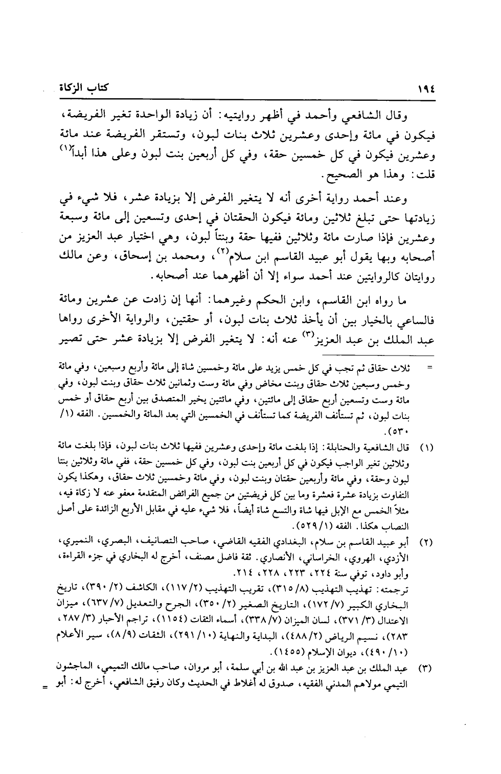 وَعند أَحْمد رِوَايَة أُخْرَى أَنه لَا يتَغَيَّر الْفَرْض إِلَّا بِزِيَادَة عشر، فَلَا شَيْء فِي زيادتها حَتَّى تبلغ ثَلَاثِينَ وَمِائَة فَيكون الحقتان فِي إِحْدَى وَتِسْعين إِلَى مائَة وَسَبْعَة وَعشْرين فَإِذا صَارَت مائَة وَثَلَاثِينَ فَفِيهَا حقة وبنتا لبون، وَهِي اخْتِيَار عبد الْعَزِيز من أَصْحَابه وَبهَا يَقُول أَبُو عبيد الْقَاسِم ابْن سَلام، وَمُحَمّد بن إِسْحَاق، وَعَن مَالك رِوَايَتَانِ كالروايتين عِنْد أَحْمد سَوَاء إِلَّا أَن أظهرهمَا عِنْد أَصْحَابه.