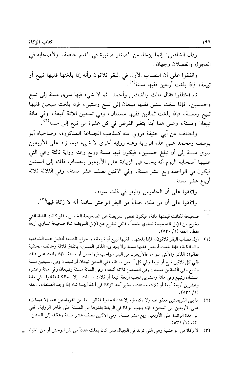 ثمَّ اخْتلفُوا فَقَالَ مَالك وَالشَّافِعِيّ وَأحمد: ثمَّ لَا شَيْء فِيهَا سوى مُسِنَّة إِلَى تسع وَخمسين، فَإِذا بلغت سِتِّينَ فَفِيهَا تبيعان إِلَى تسع وَسِتِّينَ، فَإِذا بلغت سبعين فَفِيهَا تبيع ومسنة، فَإِذا بلغت ثَمَانِينَ فَفِيهَا مسنتان، وَفِي تسعين ثَلَاثَة أتبعة، وَفِي مائَة تبيعان ومسنة، وعَلى هَذَا ابدا يتَغَيَّر الْفَرْض فِي كل عشرَة من تبيع إِلَى مُسِنَّة.