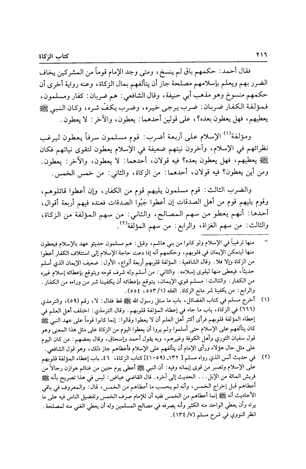 ومؤلفة الْإِسْلَام على أَرْبَعَة أضْرب: قوم مُسلمُونَ سَرفًا يُعْطون ليرغب نظرائهم فِي الْإِسْلَام، وَآخَرُونَ نيتهم ضَعِيفَة فِي الْإِسْلَام يُعْطون لتقوى نياتهم فَكَانَ - صَلَّى اللَّهُ عَلَيْهِ وَسَلَّم َ - يعطيهم، فَهَل يُعْطون بعده؟ فِيهِ قَولَانِ، أَحدهمَا: لَا يُعْطون، والأخر: يُعْطون.