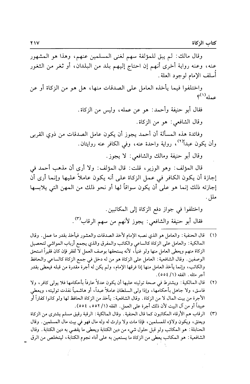 قَالَ الْمُؤلف: وَهُوَ الْوَزير، قلت: قَالَ الْمُؤلف: وَلَا أرى أَن مَذْهَب أَحْمد فِي إجَازَة أَن يكون الْكَافِر فِي عمل الزَّكَاة على أَنه يكون عَاملا عَلَيْهَا وَإِنَّمَا أرى أَن إِجَازَته ذَلِك إِنَّمَا هُوَ على أَن يكون سواقا لَهَا أَو نَحْو ذَلِك من المهن الَّتِي يلابسها ملل.