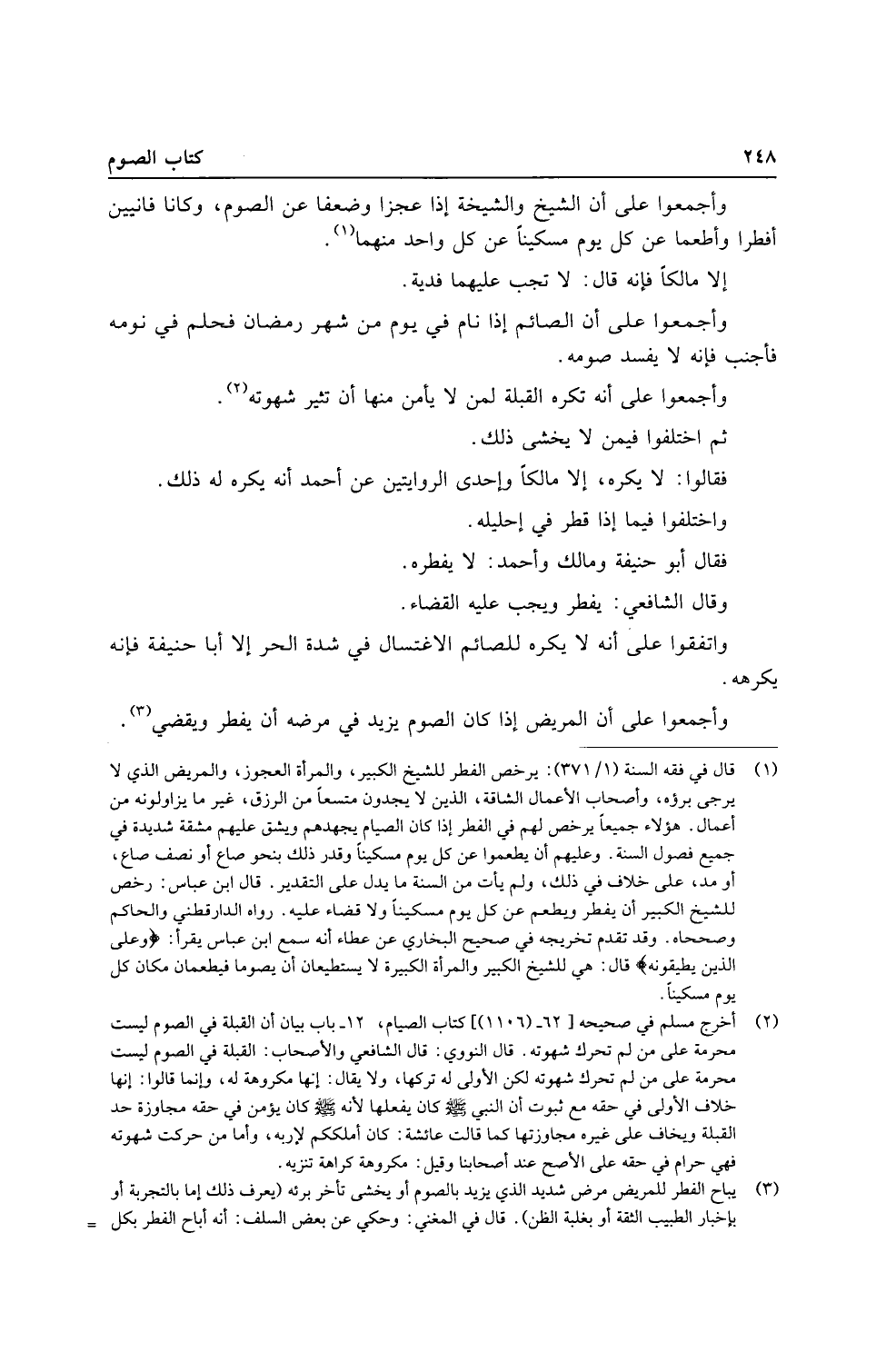 وَأَجْمعُوا على أَن الشَّيْخ وَالشَّيْخَة إِذا عَجزا وضعفا عَن الصَّوْم، وَكَانَا فانيين أفطرا وأطعما عَن كل يَوْم مِسْكينا عَن كل وَاحِد مِنْهُمَا.