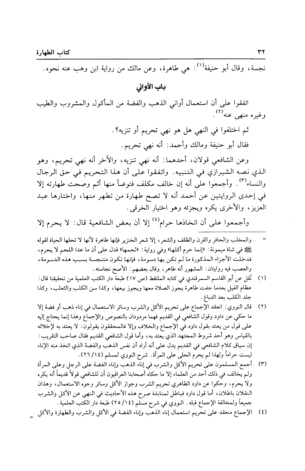اتَّفقُوا على أَن اسْتِعْمَال أواني الذَّهَب وَالْفِضَّة من الْمَأْكُول والمشروب وَالطّيب وَغَيره مَنْهِيّ عَنهُ.