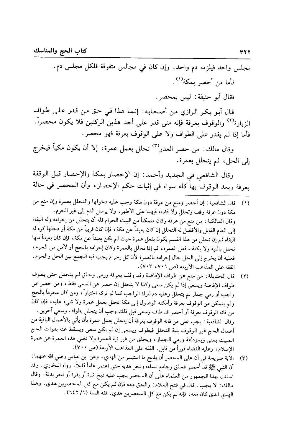 قَالَ أَبُو بكر الرَّازِيّ من أَصْحَابه: إِنَّمَا هَذَا فِي حق من قدر على طواف الزِّيَارَة وَالْوُقُوف بِعَرَفَة فَإِنَّهُ مَتى قدر على أحد هذَيْن الرُّكْنَيْنِ فَلَا يكون محصرا.