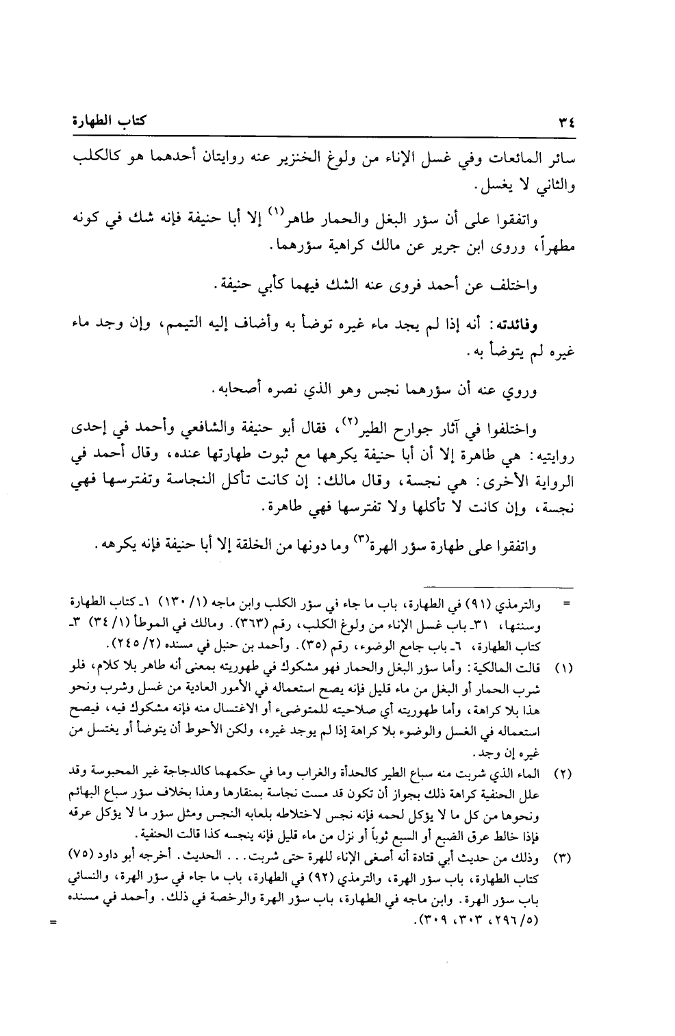 وَاتَّفَقُوا على طَهَارَة سُؤْر الْهِرَّة وَمَا دونهَا من الْخلقَة إِلَّا أَبَا حنيفَة فَإِنَّهُ يكرههُ.