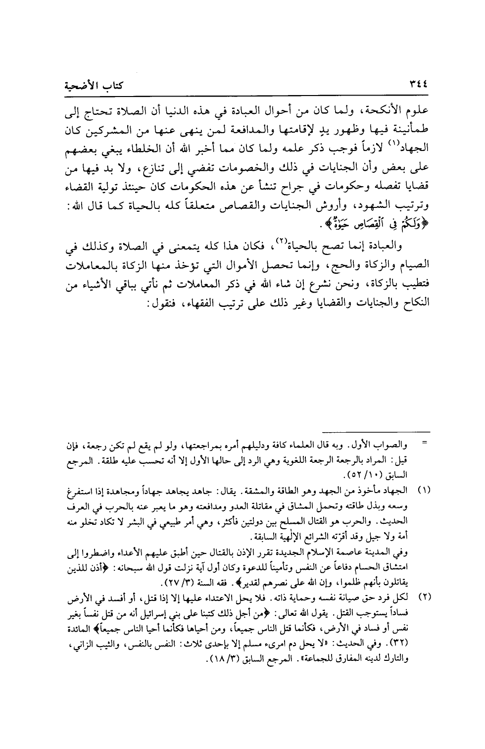 عُلُوم الْأَنْكِحَة، وَلما كَانَ من أَحْوَال الْعِبَادَة فِي هَذِه الدُّنْيَا أَن الصَّلَاة تحْتَاج إِلَى طمأنينة فِيهَا وَظُهُور يَد لإقامتها والمدافعة لمن ينْهَى عَنْهَا من الْمُشْركين كَانَ الْجِهَاد لَازِما فَوَجَبَ ذكر علمه وَلما كَانَ مِمَّا أخبر اللَّهِ أَن الخلطاء يَبْغِي بَعضهم على بعض وَإِن الْجِنَايَات فِي ذَلِك والخصومات تُفْضِي إِلَى تنَازع، وَلَا بُد فِيهَا من قضايا تفصله وحكومات فِي جراح تنشأ عَن هَذِه الحكومات كَانَ حِينَئِذٍ تَوْلِيَة الْقَضَاء وترتيب الشُّهُود، وأروش الْجِنَايَات وَالْقصاص مُتَعَلقا كُله بِالْحَيَاةِ كَمَا قَالَ اللَّهِ: {وَلكم فِي الْقصاص حَيَاة} .