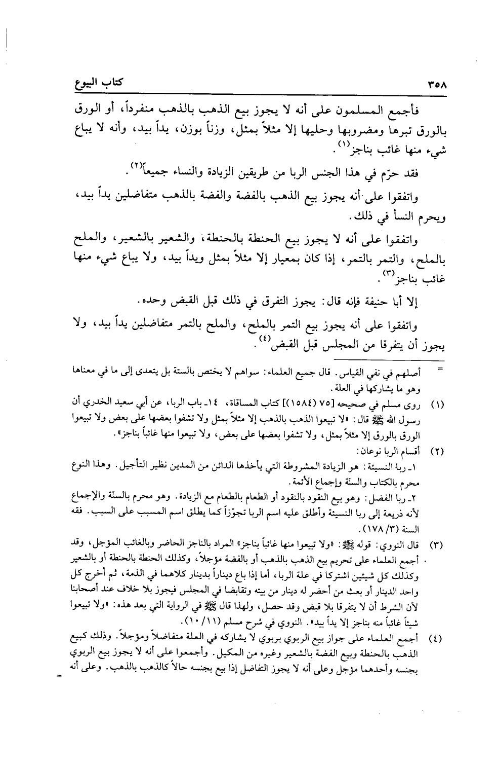 فأجمع الْمُسلمُونَ على أَنه لَا يجوز بيع الذَّهَب بِالذَّهَب مُنْفَردا، أَو الْوَرق بالورق تبرها ومضروبها وحليها إِلَّا مثلا بِمثل، وزنا بِوَزْن، يدا بيد، وَأَنه لَا يُبَاع شَيْء مِنْهَا غَائِب بناجز.